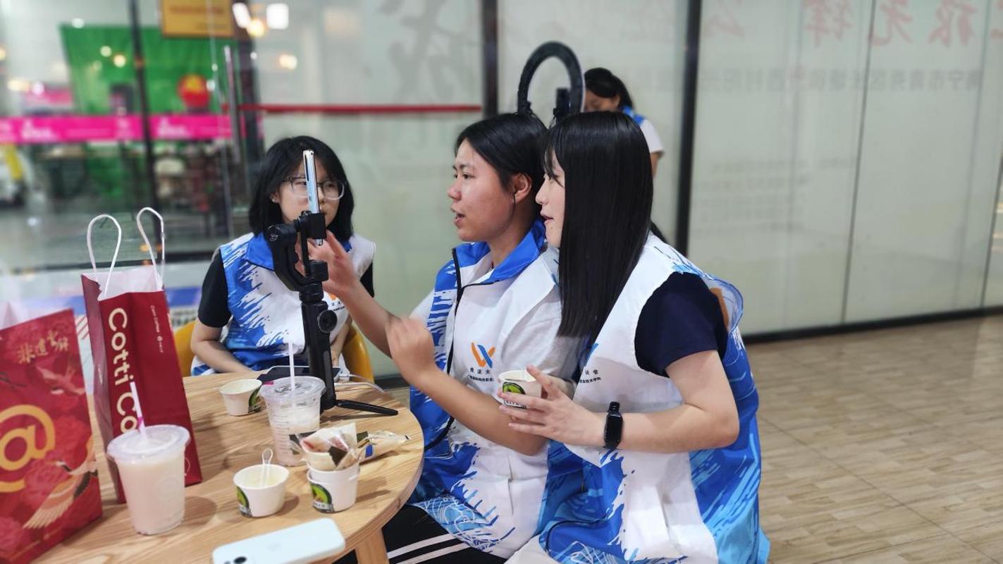 策划组采用“老带新”模式,策划方案围绕“壮乡风情+本土风味”双主线,结合绣球香囊手作、油茶品鉴,打造“玩+吃+乐”的沉浸式体验。直播组则直面流量考验,学生主播结合非遗元素与产品卖点实时互动。摄制组穿梭于各场景,拍摄并剪辑视频,同步上传至“空中课堂”抖音账号及个人平台。