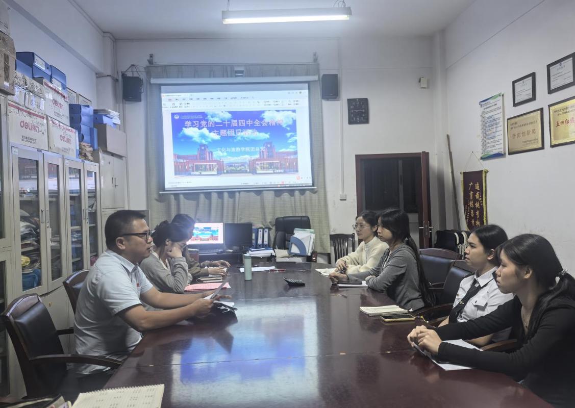 为深入学习贯彻党的二十届四中全会精神,引导广大青年团员坚定理想信念,增强责任感和使命感,11月12日至13日,文化与旅游学院团总支分别在大学路校区、东盟校区开展了学习党的二十届四中全会精神主题团日活动。活动由学院团总支书记石建威主持,2024级、2025级各班团支书兼班长参加。