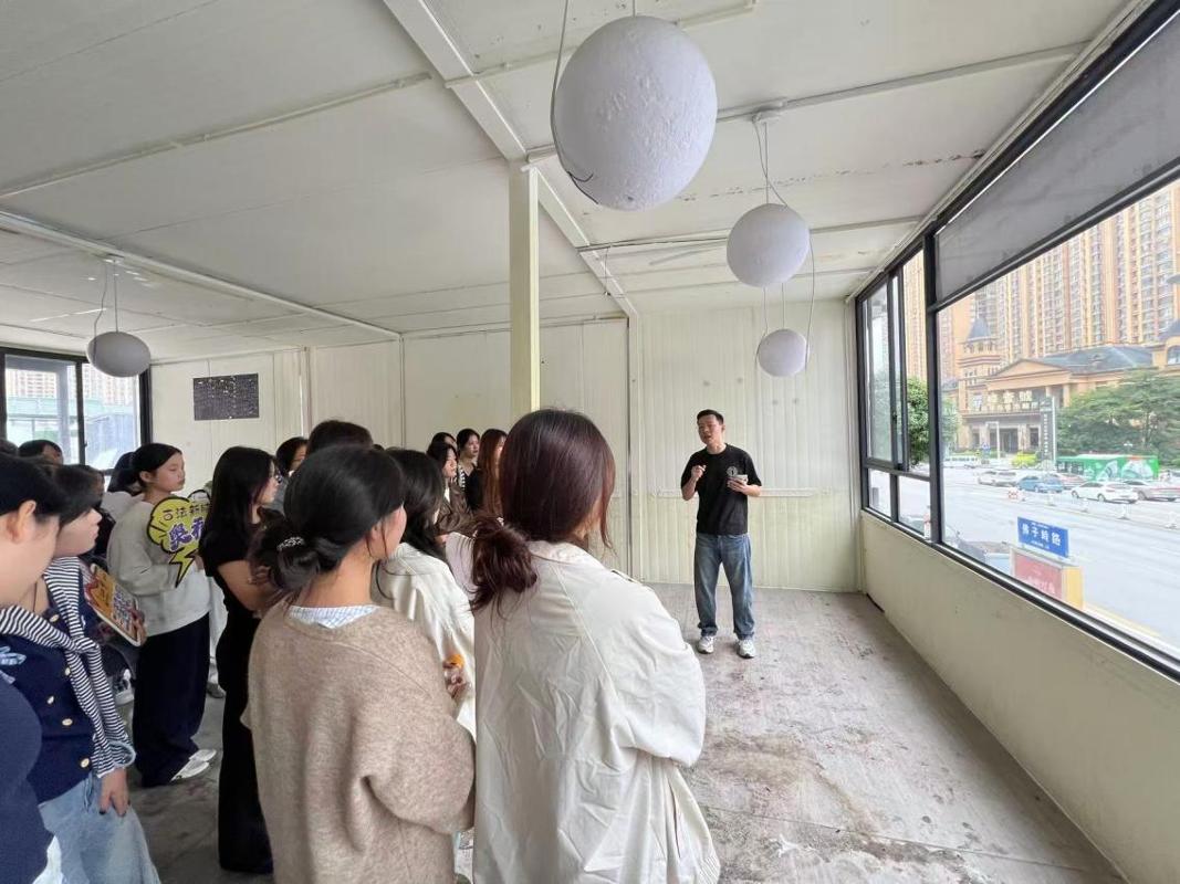 在实践环节,学生以小组为单位开展多元化实训任务,EPIP模式让学生真正成为项目推进的参与者与贡献者。12支直播小组围绕“装修探班、商圈揭秘、品牌故事”主题,开展不间断定位直播,通过生动讲解店铺设计理念,搭配非遗调饮文化内涵,获得了直播体验和一定流量。短视频创作方面,学生发挥创意,拍摄纪实类、剧情类、攻略类素材十余条,既有装修细节与商圈人流的真实记录,也有融入非遗元素的创意短剧,生动传递“斟明月”品牌特色。此外,学生还深入调研商业街客群需求、竞品情况,为店铺后续运营提供实用参考。