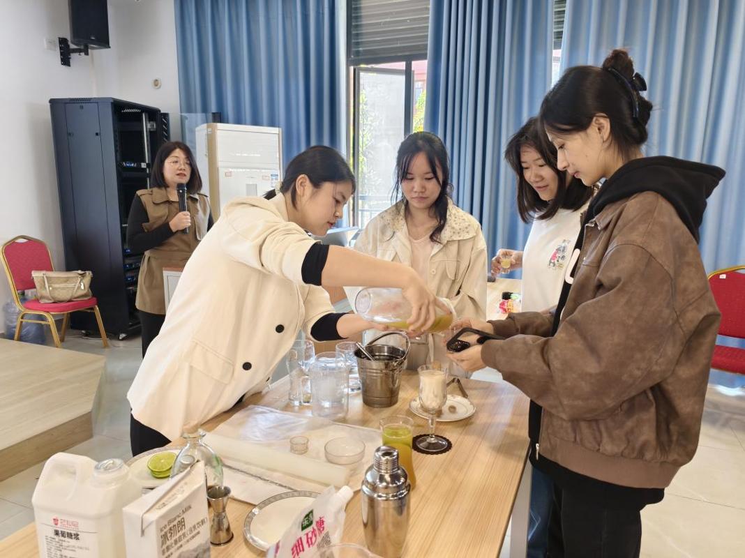 实训周期间,整体围绕校企协同项目展开,设置“认知-体验-实操-创新”四阶环节。同学们首先系统了解三土生物科技的核心产品体系及运营模式,重点学习非遗调饮的研发逻辑与文化内涵——从非遗养生元素的融入,到广西本土食材的甄选,全方位感受“非遗+饮品”的创新融合路径。随后党员教师与企业方配合,演示调制独具特色的新式调饮。在品鉴环节,学生们尝试了五指毛桃汤底、茉莉花汤底等搭配非遗黄酒元素调制的主题饮料,直观感受产品风味与文化底蕴,为后续创意输出积累素材。