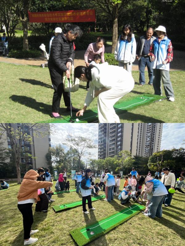11月10日至13日,为深化“三全育人”综合改革,推动专业教育与实践服务、养老需求深度融合,文化与旅游学院在本学期技能进阶周期间,联合上平社区、上海绿地物业服务有限公司南宁分公司、库克启航专升本公司开展了一场别开生面的高尔夫球社区康养活动。2025级智慧健康养老服务与管理专业学子以专业实践为笔,为社区居民送去健康与欢笑,让青春力量为养老服务注入新活力。