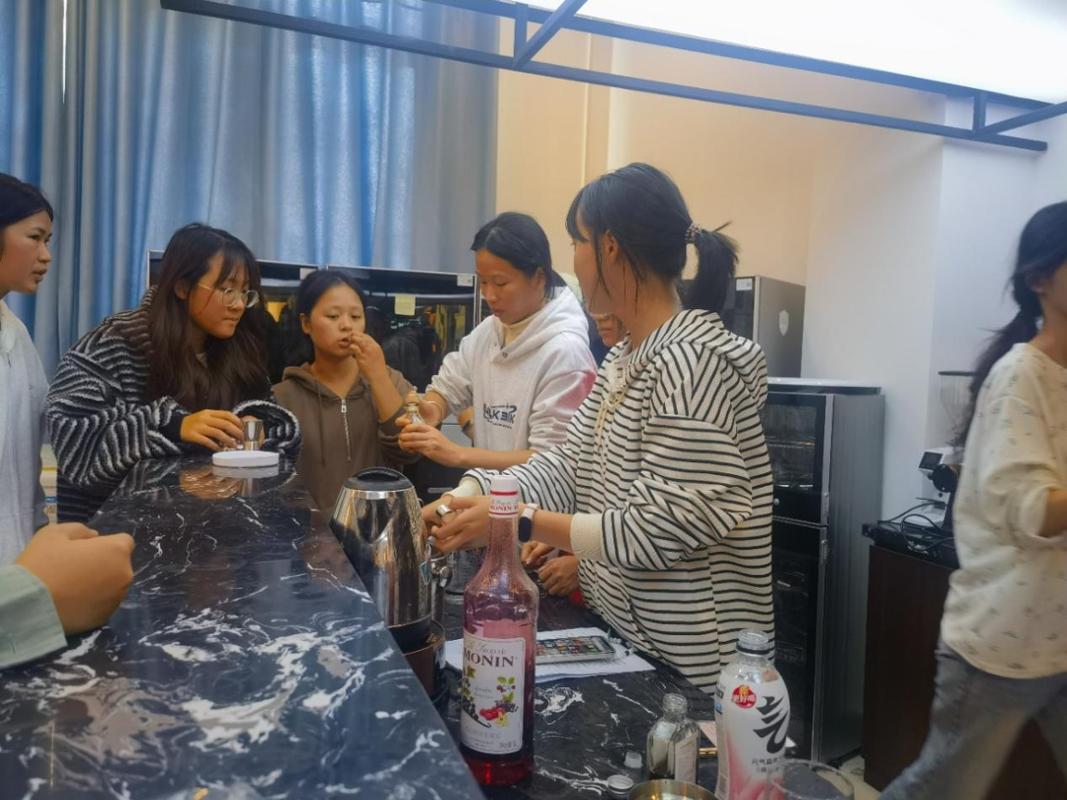 为保障学生创意落地,12月8日起,学院特别开放8-3-101教室作为专属实践空间,允许学生在非课程时段自由进入开展调饮尝试、配方迭代与团队研讨。专属实践场地的开放,为学生提供了便捷的实操平台,进一步激发了大家的创新积极性,让“创思、笃行、协作、共赢” 的赛事理念落到实处。