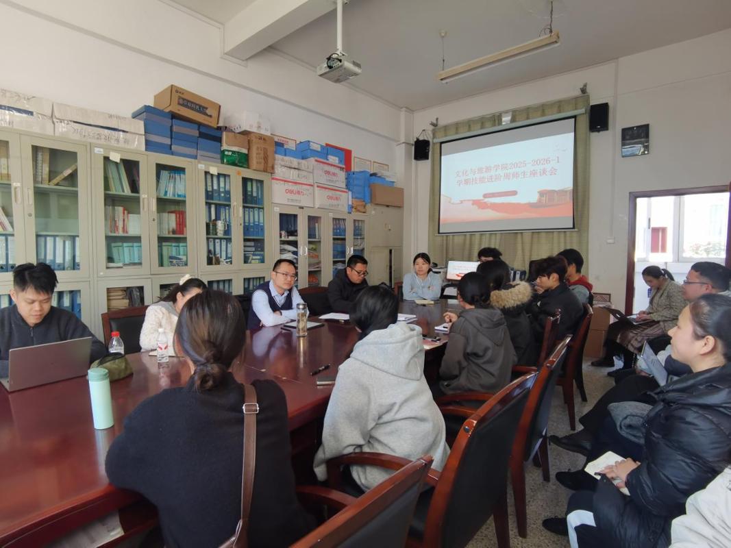为系统复盘本学期技能进阶周活动成效,精准对接师生需求,持续完善学院职业技能培养体系,12月26日下午,文化与旅游学院在大学路校区、东盟校区同步召开技能进阶周师生座谈会。会议分别由学院副院长黄志康、学院党总支专职副书记吴柳蓉主持,2024级与2025级各专业学生代表、学院实训指导教师、辅导员及教学干事参会。