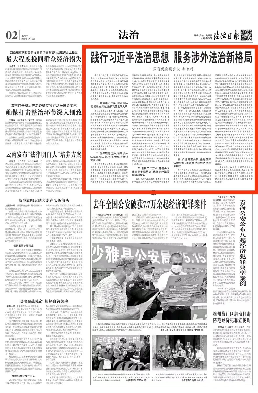 5月16日,《法治日报》刊发中国贸促会副会长柯良栋同志文章《践行习近平法治思想 服务涉外法治新格局》,全文如下: