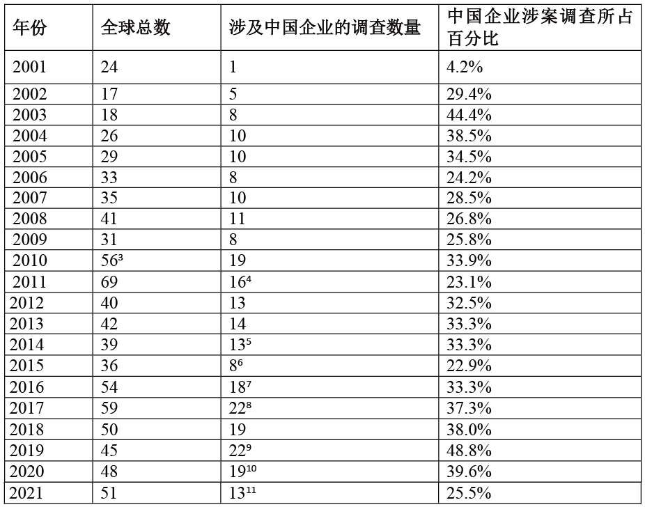 表一:2001年-2021年中国涉案美国337调查数量以及比率汇总