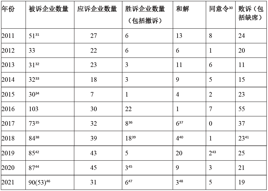 表三:2011年-2021年间中国企业美国337调查应诉情况以及结果概览[29]