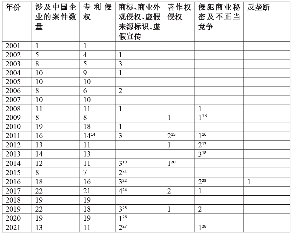 表二:2001年-2021年美国337调查涉及中国企业的案由统计表