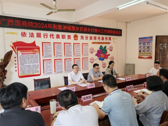 王国红一行在南丹县里湖瑶族乡政府召开了学校乡村振兴工作调研座谈会,南丹县副县长黄丽娜、里湖乡乡长陆朝金、南丹县委组织部和乡政府有关干部以及全体驻村工作队员参加会议。会上,首先由驻甲木村第一书记敬礼代表驻村工作队,向学校汇报2024年上半年乡村振兴帮扶工作开展情况,分别从党纪学习教育、基层党组织标准化建设、党建+产业发展、村内基建环境建设、发展特色产业、促进农户增收、减少低收入组群体等方面,对6个定点帮扶村工作情况进行总结。随后,陆朝金对学校长期为里湖乡和定点帮扶村各项帮扶工作的努力付出表示衷心感谢,在学校的支持下,各村在基础建设、环境整治、产业发展、群众增收方面均取得了不错成效,为里湖乡的旅游宣传、电商推广、非遗传承和教育事业也做出了积极贡献,希望学校能进一步发挥职教专业特长,结合乡村振兴学院培育工作平台,加大帮扶就业、发展产业等方面的帮扶力度,共同实现乡村振兴帮扶取得新成效。接着,黄丽娜对驻村工作队员的工作能力表示肯定,相信能全面推进各村乡村振兴有关工作的落实,并希望与学校共同努力,在推进当地自治区级旅游度假区项目建设及大健康康养产业发展等方面进行深度合作。