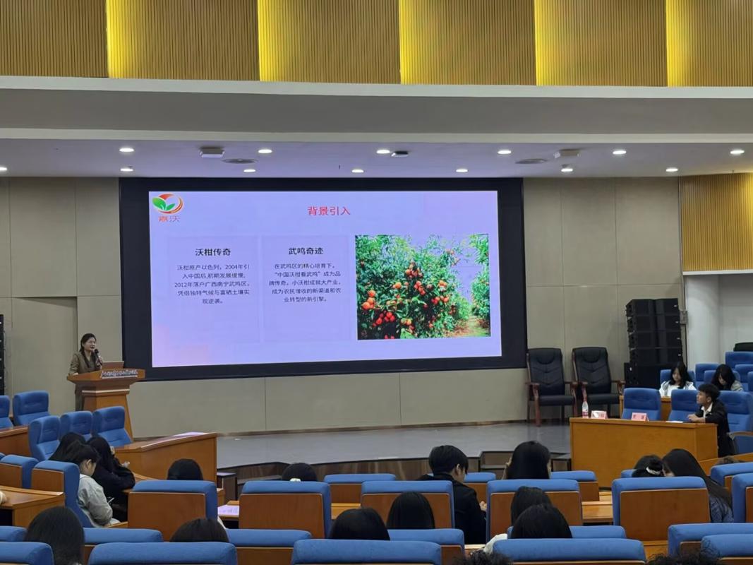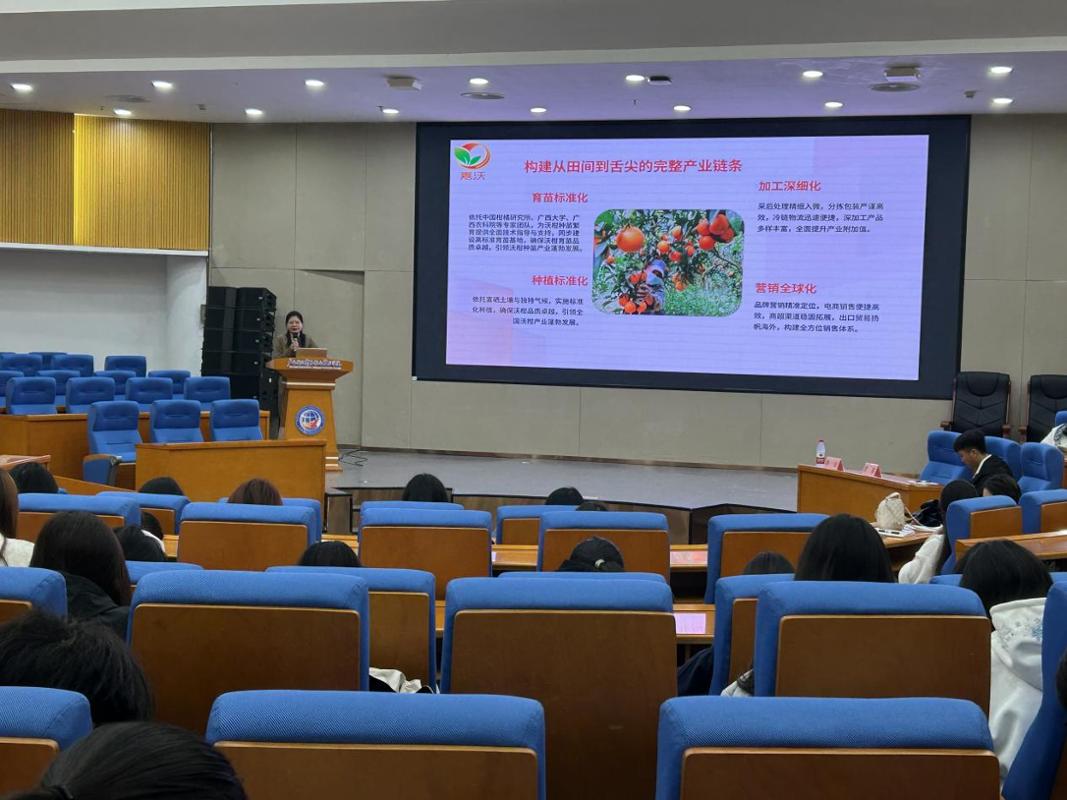 讲座中,梁钰女士围绕沃柑产业展开系统讲解,将全产业链环节拆解成这样一个个带数据、有画面的生动案例,让同学们仿佛跟着一颗沃柑“走”完了从田间地头的阳光雨露里萌芽,到经过精细加工穿上“包装外衣”,再通过物流网络跨越山海,最终摆上消费者餐桌的完整旅程,也让大家真切理解了“流通”二字在农产品产业中的实际意义——不是简单的“运输 + 销售”,而是串联起生产、加工、物流、营销的全链条保障。
