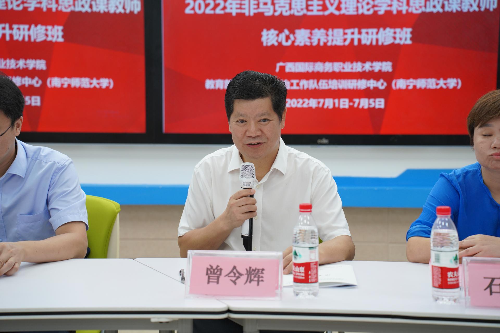 曾令辉指出,本次研修班的举办,恰逢中国共产党建党101周年,体现了广西国际商务职业技术学院党委、行政对思政课、思政课教师的高度重视,是落实习近平总书记对思政课教师提出的“政治要强、情怀要深、思维要新、视野要广、自律要严、人格要正”重要讲话精神的创新举措,走在全区高校马院思政课教师队伍建设前列。非马克思主义学科背景思政课教师要在“专”的方面下足功夫,提升专业素养,丰富专业知识,增强专业认同,树牢马克思主义信仰。他希望参训学员一要“破”,破除不合时宜的旧思想旧做法,端正学习态度,激发学习的内生动力;二要“立”,树立新的思政教育教学理论、教育观念、教学方法、教学评价改革等;三“悟”,从“破”和“立”中,悟到提升自身核心素养、明确职业发展方向,把教学与研究结合起来,讲深、讲透、讲活思政课道理。