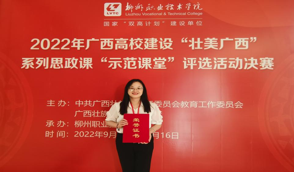 为扎实推进习近平新时代中国特色社会主义思想进教材、进课堂、进师生头脑,落实立德树人任务。由自治区党委教育工委、自治区教育厅主办的全区高校建设“壮美广西”系列思政课“示范课堂”决赛近日在柳州职业技术学院举行。周梵林老师展示的示范课堂《建设数字广西 成就时代新人》荣获二等奖。