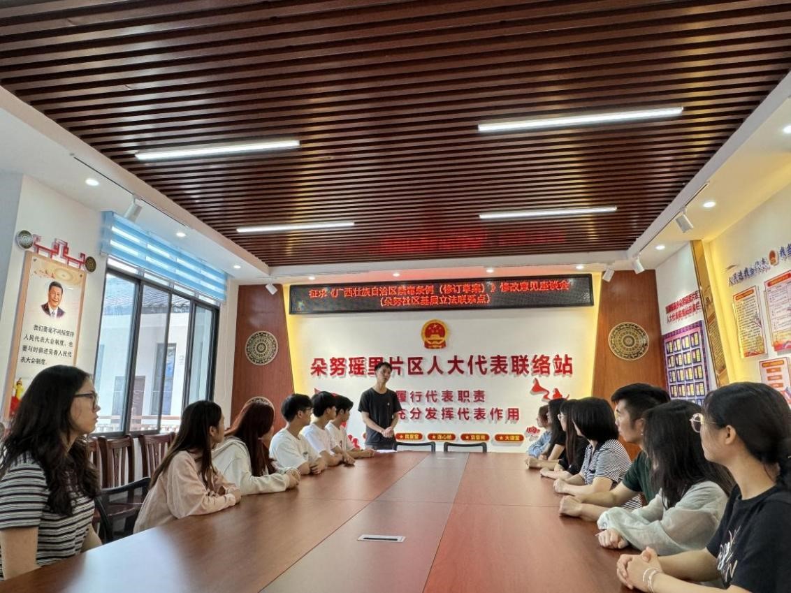 5月11日上午,师生一行来到里湖乡朵努社区开展“大思政课”实践教学活动。在南丹县里湖瑶族乡朵努社区,居民参与基层社会治理取得了良好的效果,为了让同学们更加深入理解“全过程人民民主”的丰富内涵,曾成健老师以《发展全过程人民民主需要让人民当“主角”》为主题,为师生们讲述朵努社区发展基层民主的制度创新和实践创新,增强同学们对“什么是全过程人民民主”的深刻理解,认识到全过程人民民主的时代价值。5月11日下午,师生一行来到贵州省荔波县邓恩铭烈士纪念馆继续开展“大思政课”实践教学活动。