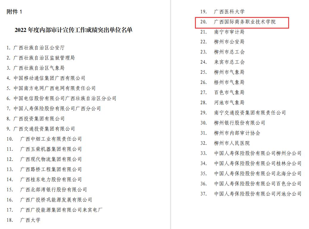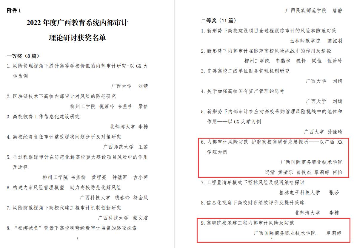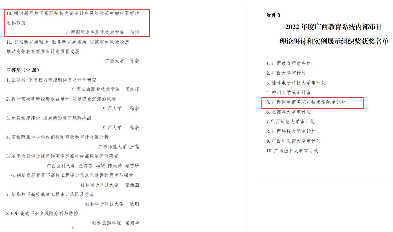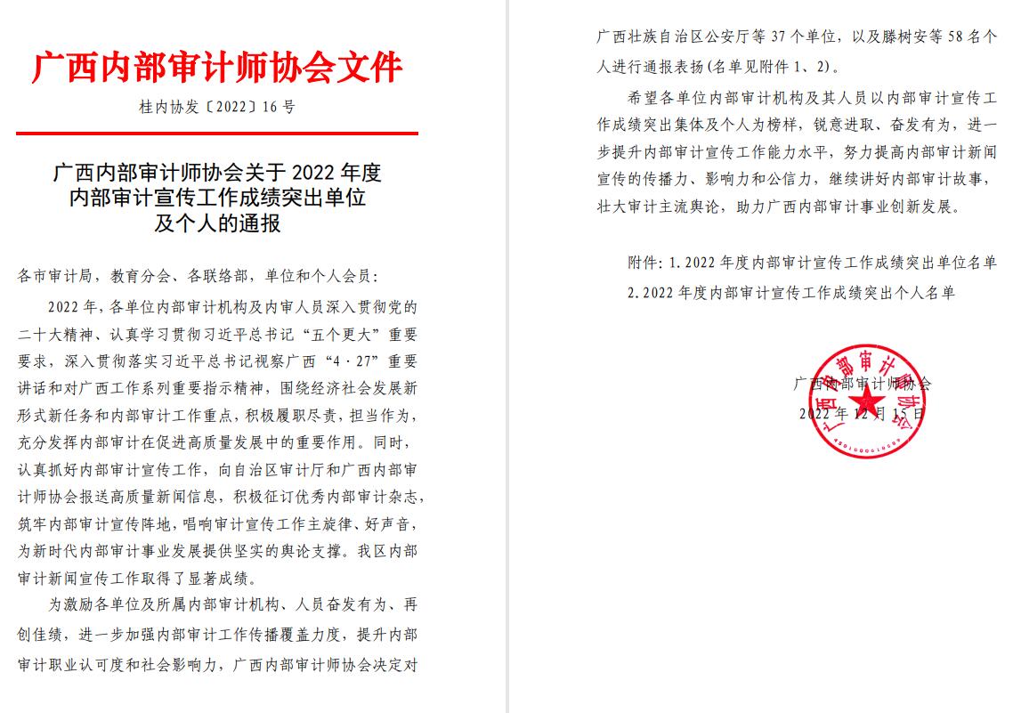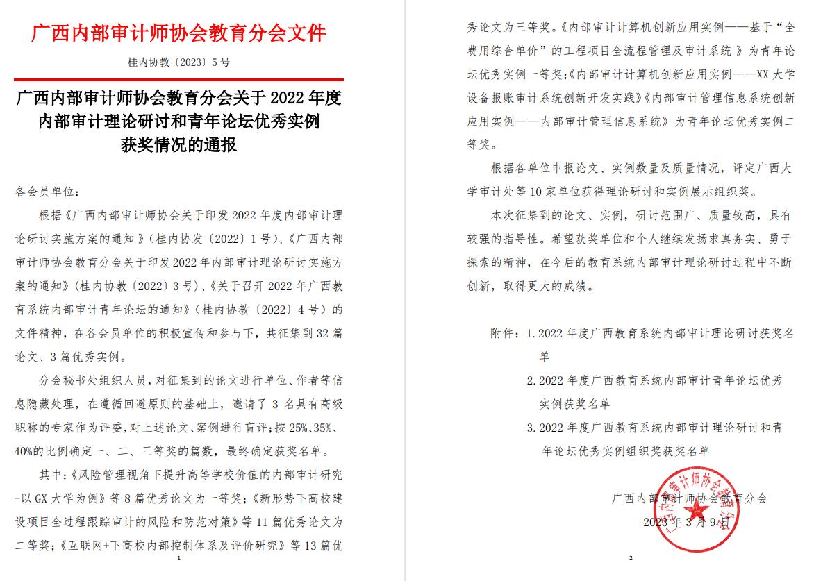 同时,在广西内部审计师协会关于2022度内部审计宣传工作成绩突出单位及个人的通报中,我校获得“2022年度内部审计宣传工作成绩突出单位”的荣誉,我校审计处投稿的三篇论文也获得了“2022年度广西教育系统内部审计理论研讨二等奖”。