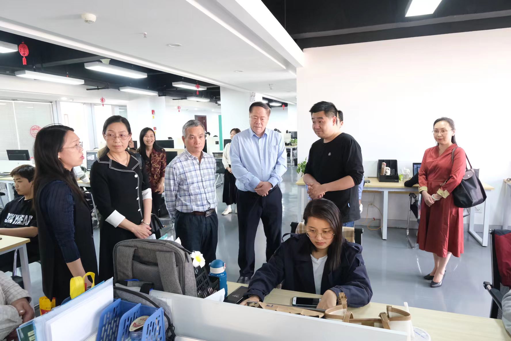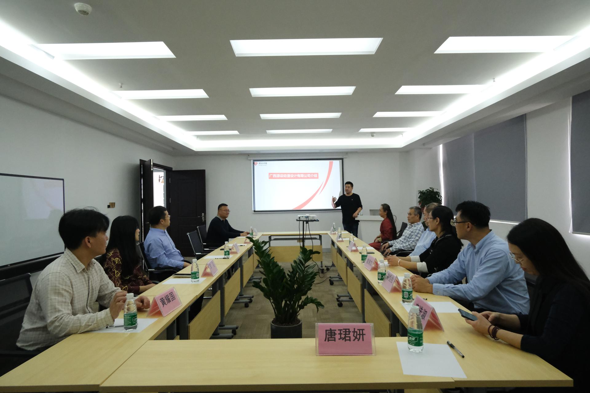 武汉中部对外集团总经理李军、副总经理李茗、副总经理兼广西源设动漫设计有限公司总经理王明智、国际派遣部经理包啸磊、武汉中部对外集团广西分公司招生就业经理黄耀国等人陪同调研。