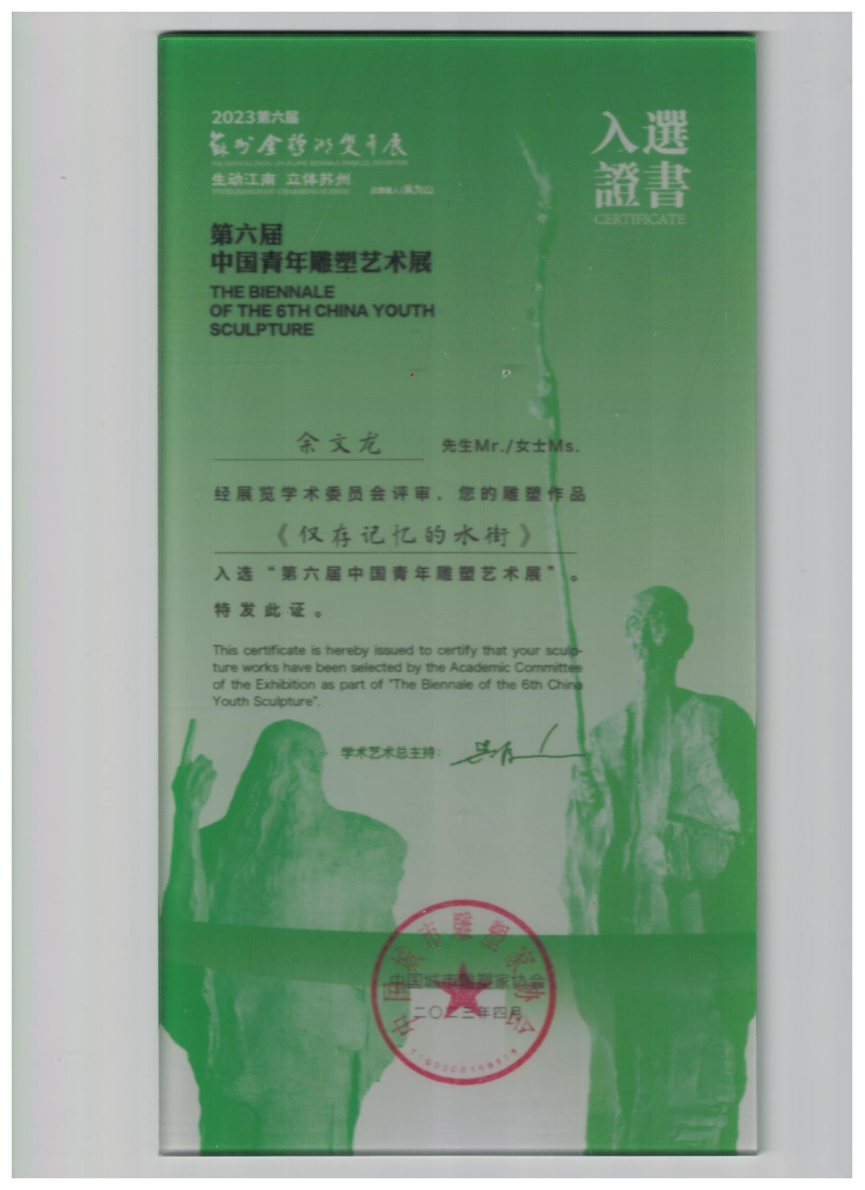 余文龙的雕刻作品先后参加2023年INNOART PRIZE 国际美术竞赛暨纽约国际艺术博览会,并获国际铜奖;参加2023年art-D全球华人艺术设计大赛,获艺术贡献奖1项,优秀奖1项,入围奖3项。与此同时,作品分别入选参展“中国姿态·第六届中国雕塑展”、“生动江南·立体苏州”——2023第六届苏州·金鸡湖双年展“第六届中国青年雕塑艺术展”等国内重要展览活动。