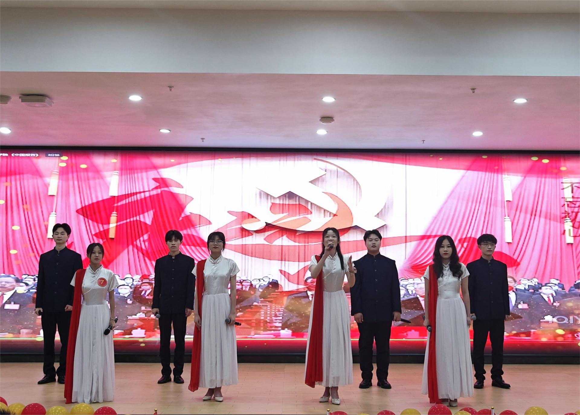比赛前夕,我院党总支积极响应学校有关部门的号召,认真组织、筹划、动员全院师生参加比赛,并由学生党支部教师党员刘阳和支部书记程琳丽分别负责此次比赛的备赛和指导工作。教师组由许雙双老师和徐君老师组成,学生一组由刘雅婷、陈张湉杨、黎露莹、赵碧亚、陈李民、关自桂、马加平、隆俊杰组成,二组由邓忠洁、唐琳云、梁诗雨、杨易婧楠、王志强、蓝显科、陈品彰、邓之杰组成。比赛中,他们用铿锵有力的语言、真挚动人的情感和感人心弦的故事,为大家演绎了一场精彩的听觉盛宴。融合音乐、服装、舞台等多种元素,声情并茂地传递了中国味、中华情和民族魂,彰显了中华优秀传统文化的无限魅力,进一步坚定了民族自豪感和文化自信心。