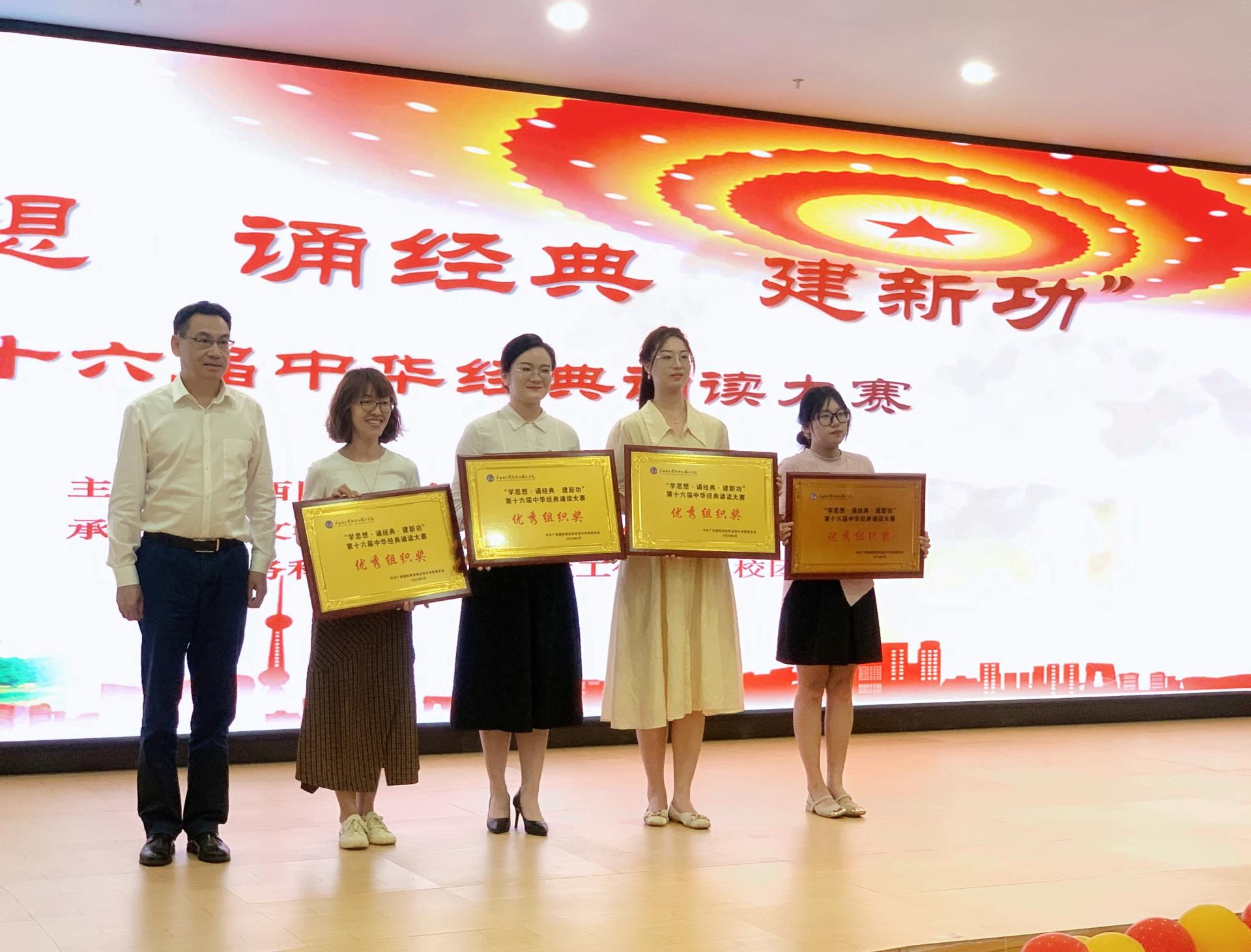 5月18日晚,为落实学习贯彻习近平新时代中国特色社会主义思想主题教育和党的二十大精神,牢牢把握“学思想,强党性,重实践,建新功”的总要求,讴歌中华民族的奋斗历程,引领师生传承红色基因,我校在东盟校区师生活动中心举行“学思想·诵经典·建新功”——第十六届中华经典诵读大赛决赛。数字艺术学院党总支共选派1组教工组和2组学生组参加本次比赛。其中,教师组朗诵作品《大山里的明灯——张桂梅》荣获三等奖,学生组朗诵作品《中国报告》和《血战湘江》分别荣获二等奖、三等奖,数字艺术学院党总支荣获优秀组织奖。