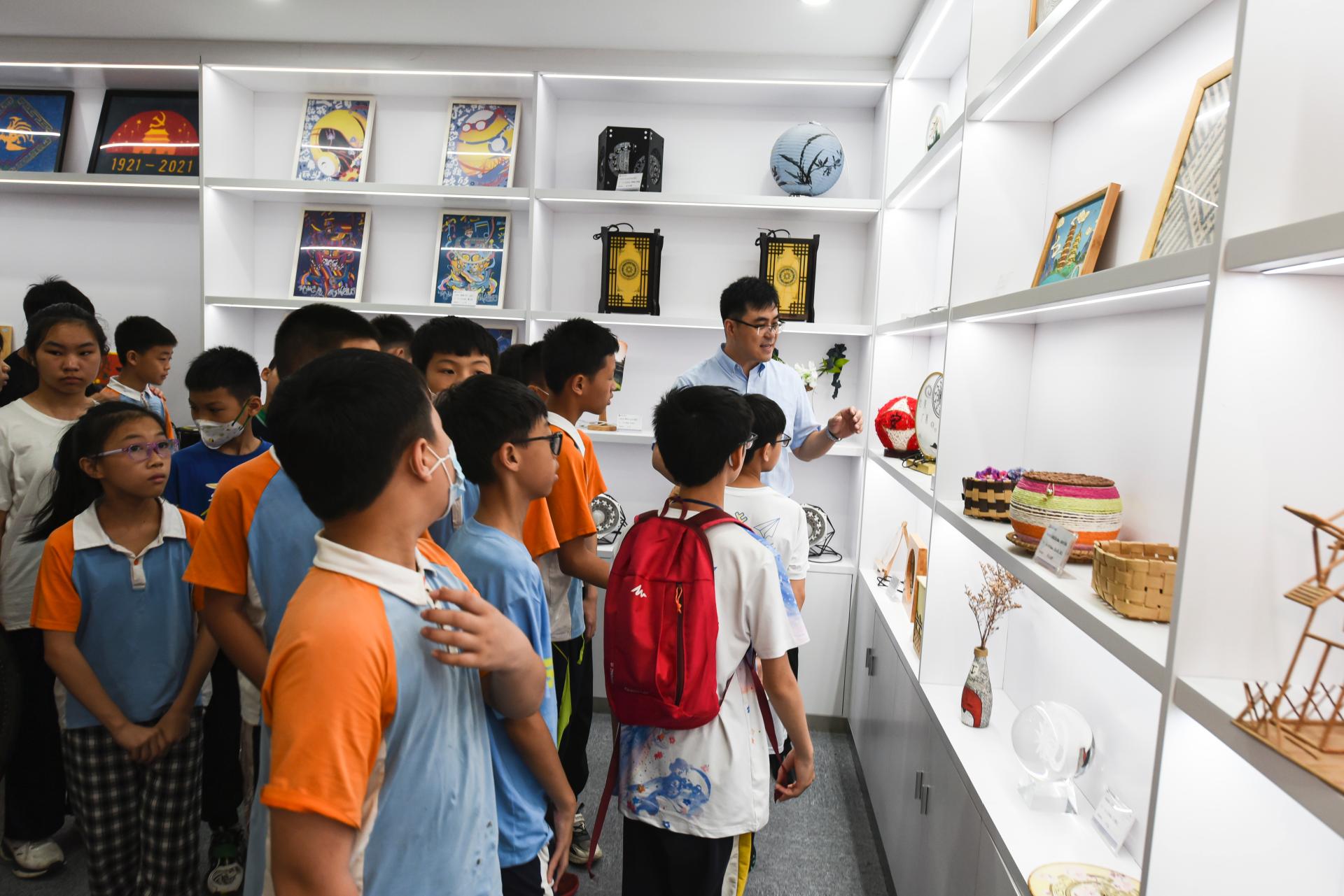 随后黄恒拾引导清川小学的师生及家长们参观非遗民族设计产品及动漫设计作品。在产品专业展区里,太阳纹、雷鸟纹、翔鹭纹等民族图样印制的丝巾、巧夺天工的皮雕制品、传统纹样与现代审美结合的民族服饰设计等都吸引了小朋友们的注意;动漫设计展区则展示了学生娴熟的画工及富有创意的艺术作品,极大地激发了孩子们的兴趣,大家纷纷驻足观看。孩子和家长们都认为学院教学成果丰硕,艺术作品别致,充满了浓厚的非遗文化氛围。