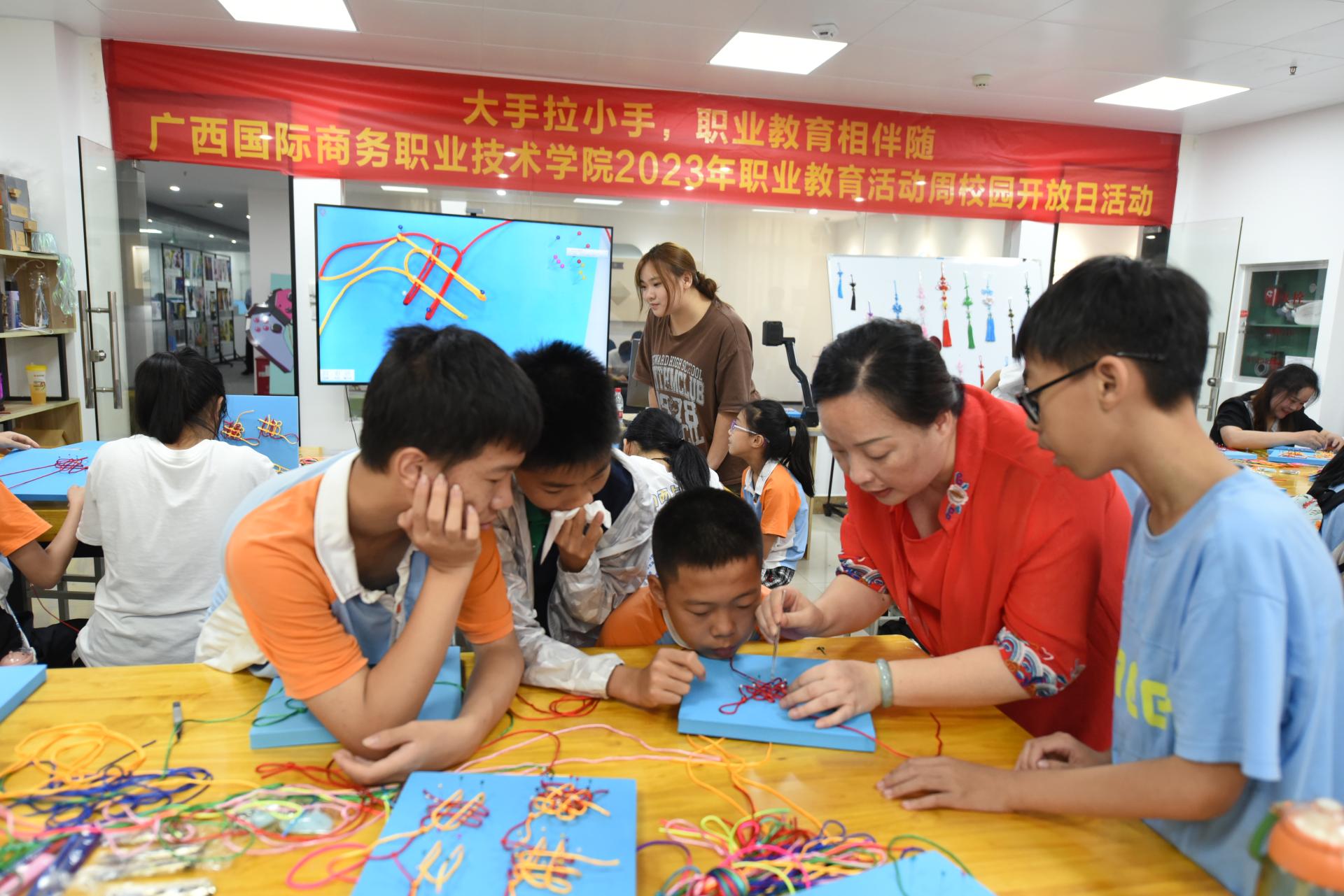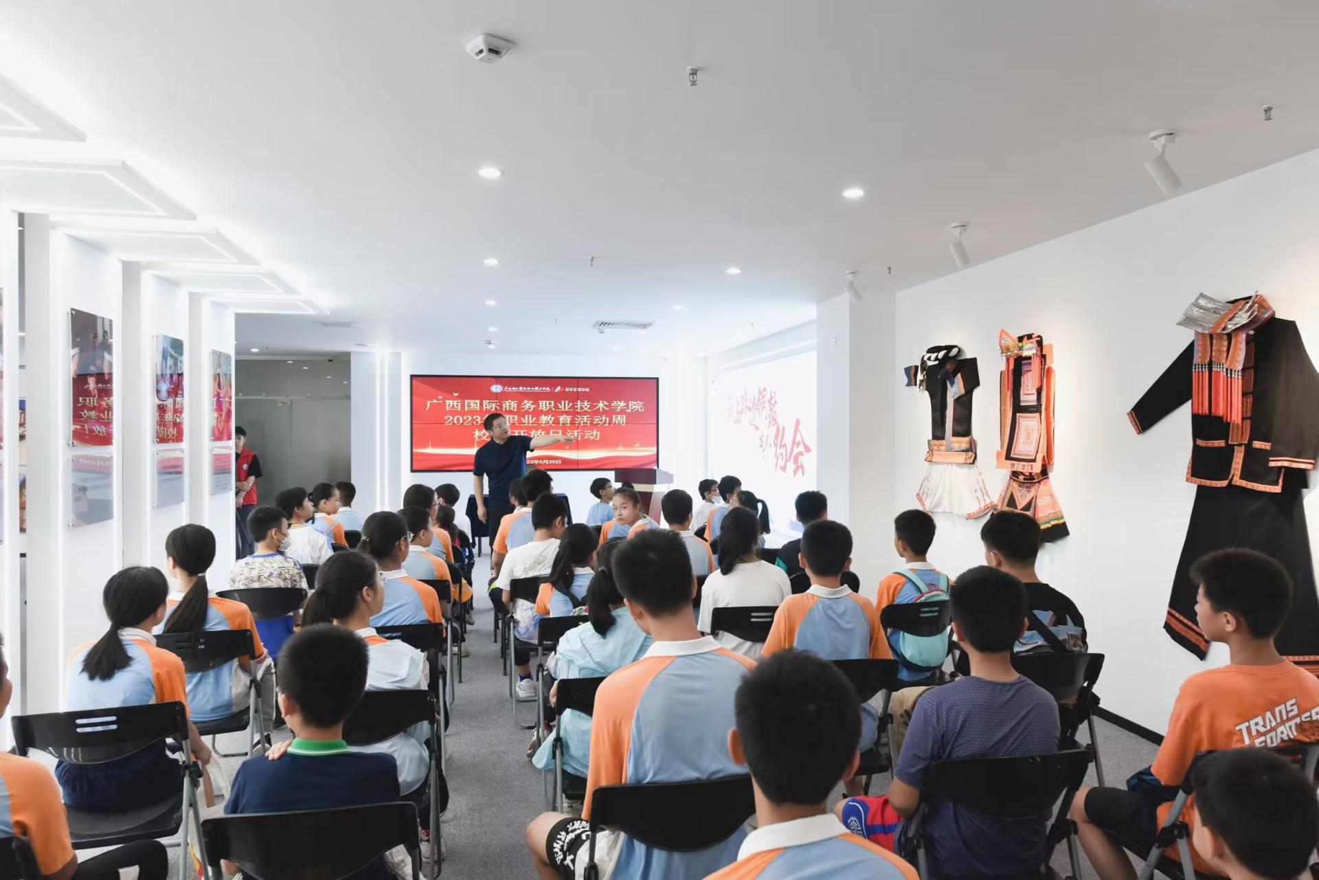5月20日上午,为贯彻落实《国家职业教育改革实施方案》以及《广西国际商务职业技术学院2023年职业教育活动周工作方案》的相关要求,强化高职院校区域服务能力,多方位展示职业教育的办学特色及教学成果。数字艺术学院在大学路校区图书馆7楼数字媒体创意实训基地成功举办了“大手拉小手,职业教育相伴随”专题职教体验活动。本次活动为广西国际商务职业技术学院2023年广西职业教育活动周系列活动之一,由数字艺术学院承办,邀请南宁市清川小学的40余名师生及家长参与。活动包括瑶族铜鼓文化讲座、民族非遗工艺品参观、非遗手工制作体验、数字艺术电子绘画体验等四大项内容。数字艺术学院党总支副书记黄恒拾、副院长叶军、办公室主任谢娉婷以及产品艺术设计教研室、实习实训教研室负责人,教师、辅导员代表、学生志愿者参加了本次活动。