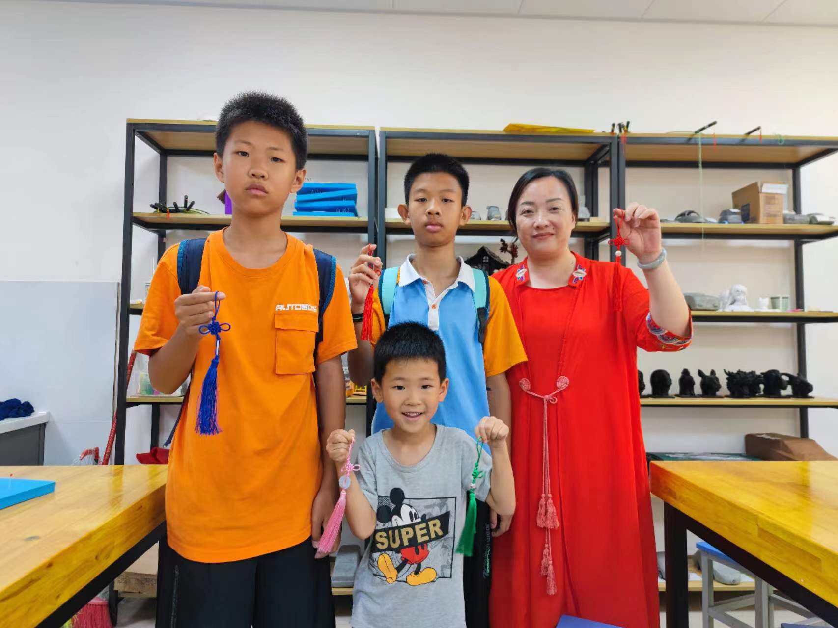 动手体验环节分别为非遗手工制作及数字艺术电子绘画两项体验项目。非遗手工制作由谢娉婷主讲,动漫及产品专业学生作为志愿者进行协助教学。体验项目具体为指导孩子们制作中国结,鲜艳的丝线在手指之间灵活缠绕,最后编织出一个小巧精美的中国结。中国结象征吉祥如意、心物合一、无始无终、永恒不灭的最高境界。