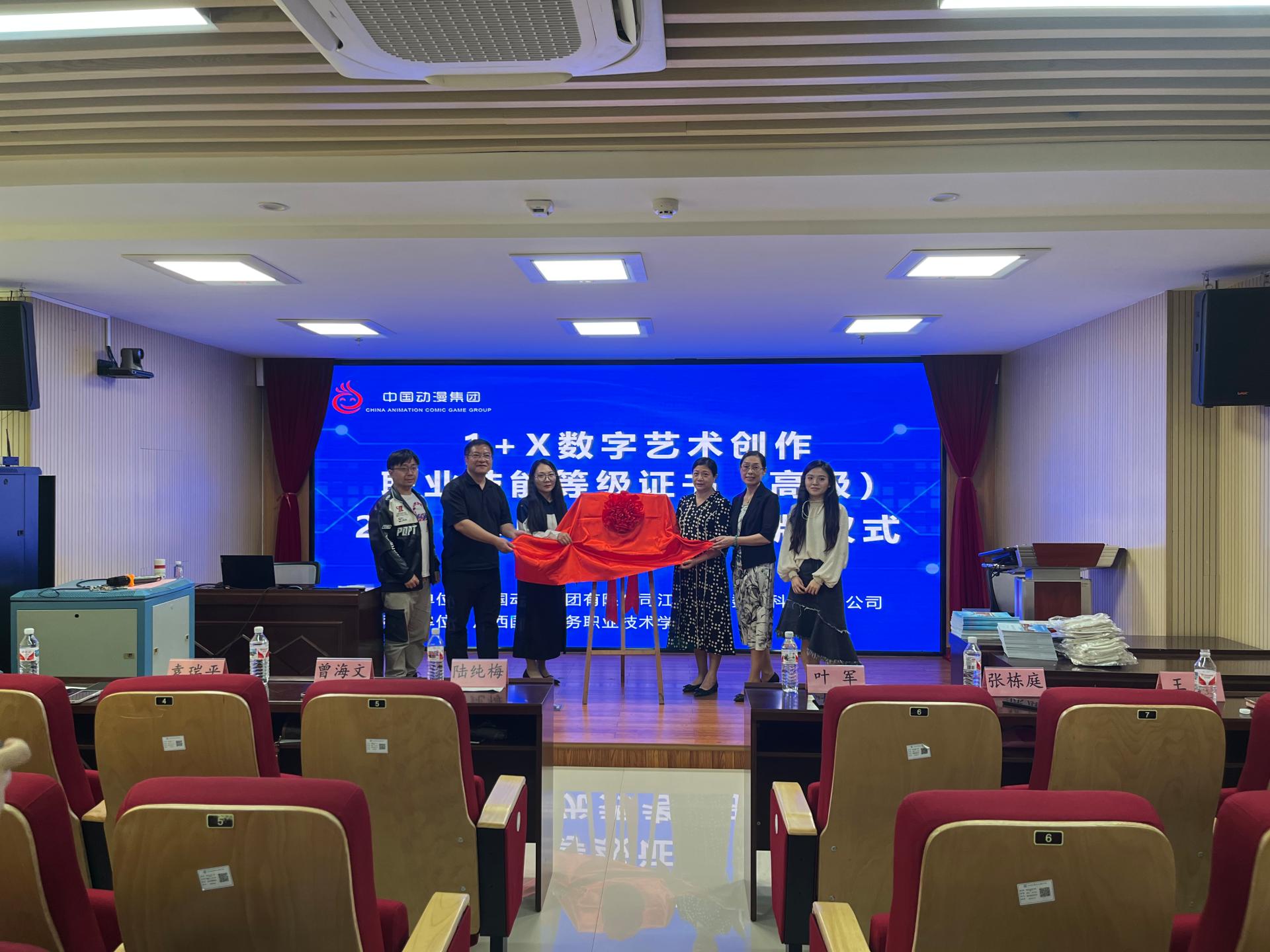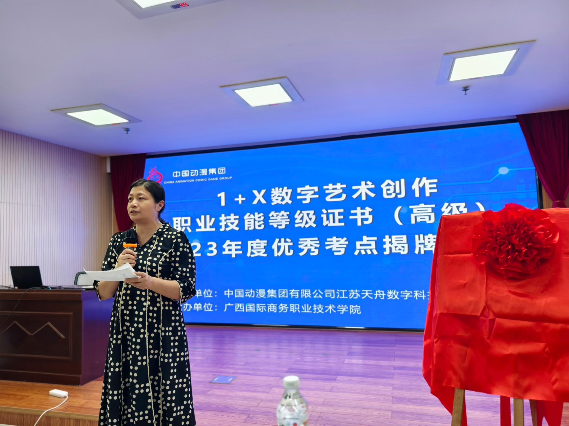 我校目前是数字艺术创作职业技能等级证书的广西区牵头院校,为推进“岗课赛证融通”,我校积极地参与1+X证书建设工作,多次组织师生参加培训及考证,连续两年保持100%的考证通过率,并获评为数字艺术创作职业技能等级(1+X)证书2023年度优秀考点。10月19日上午,中国动漫集团,动漫发展研究院袁瑞平、张栋庭、王钰为我校优秀考点进行揭牌,广西国际商务职业技术学院教务科研处处长陆纯梅、数字艺术学院院长曾海文、叶军,等出席了揭牌仪式。陆纯梅为揭牌仪式致辞,她对参与本次培训的教师和工作人员表示了衷心的感谢,并强调了“岗课赛证融通”在职业教育发展中的重要性。陆处长指出,通过这种模式,学校能够将岗位需求、课程设置、技能竞赛和职业资格认证有机结合起来,更有效地培养符合市场需求的高素质技术技能人才。