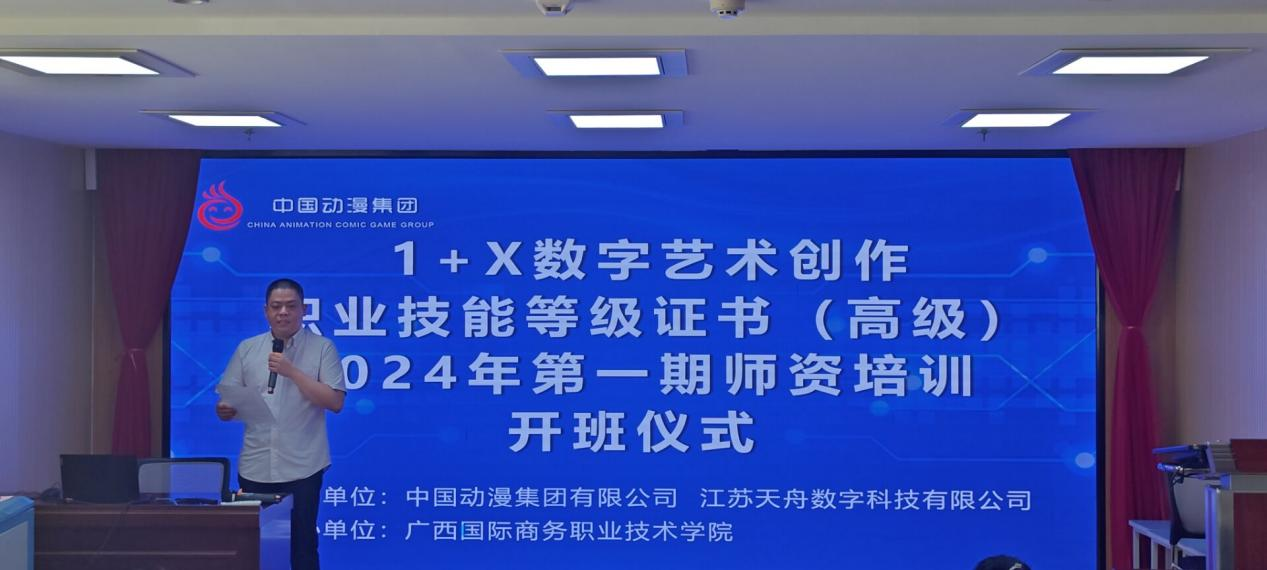 10月16日上午,广西国际商务职业技术学院教务科研处副处长玉泉、数字艺术学院副院长叶军、中国动漫集团,国家动漫创意研发中心动漫发展研究院市场总监袁瑞平、中国动漫集团教育培训中心主任助理张志鹏、中彧数创(广西)产业园运营管理服务有限公司总经理张辉及参训教师出席了培训班的开班仪式,玉泉为开班仪式致辞,他指出了学校与行业企业深度合作的优势,并预祝本次培训顺利开展。