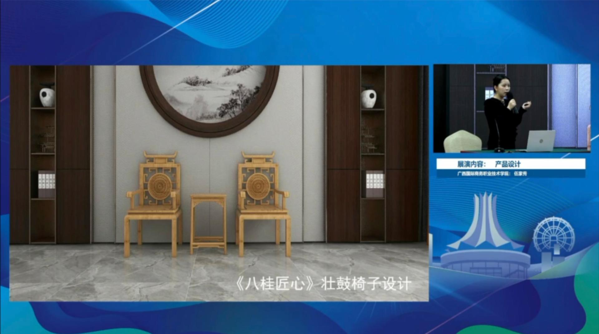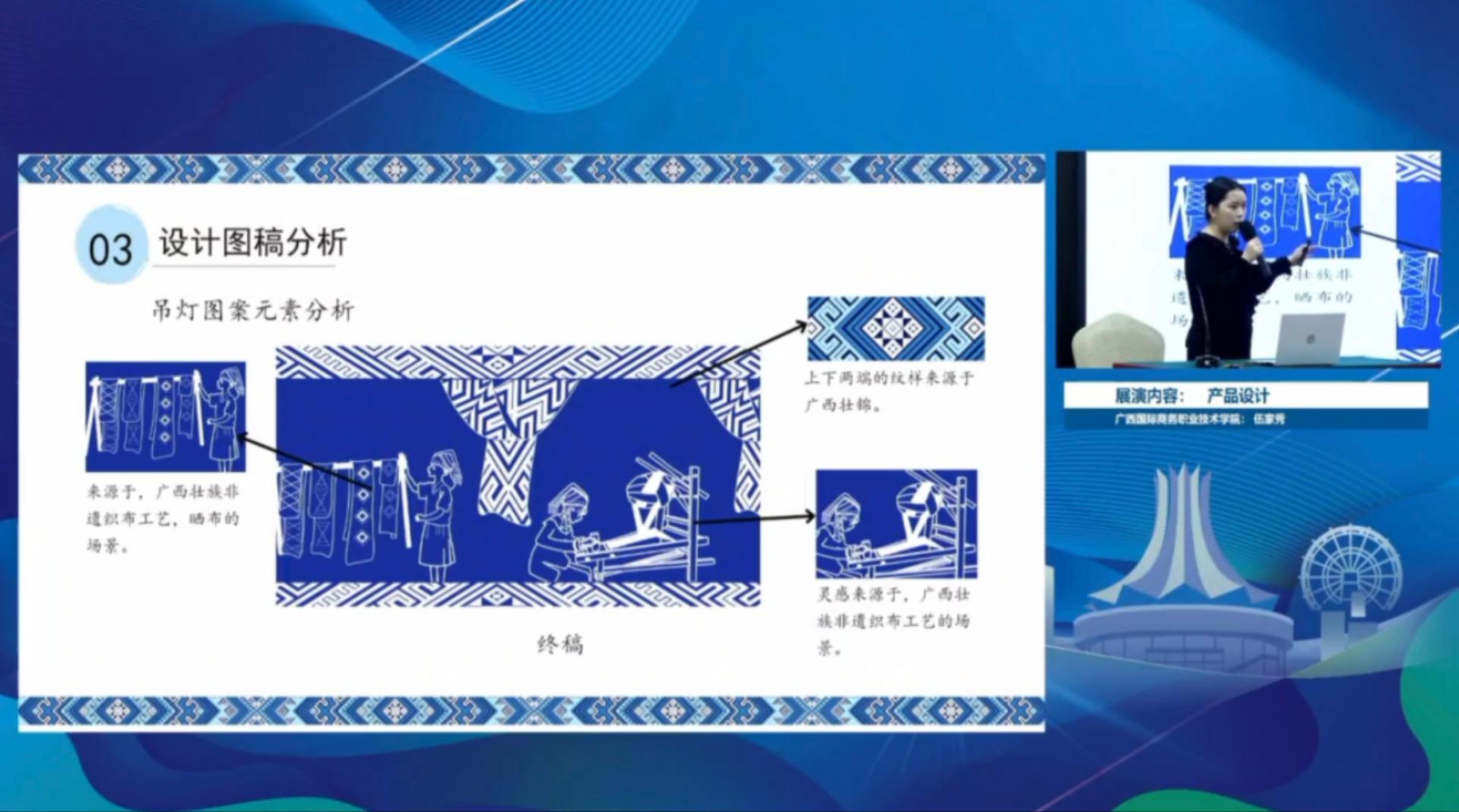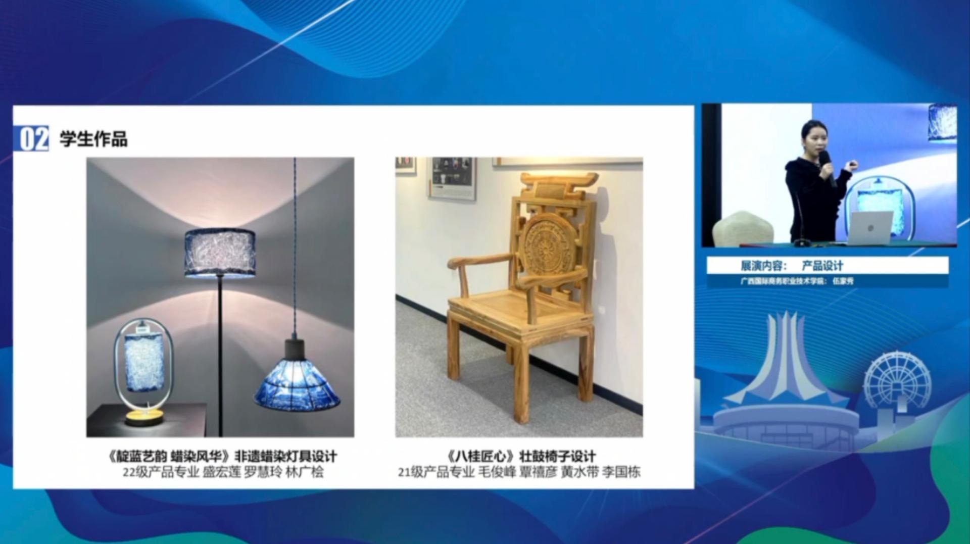 在技能展演和交流环节中,广西国际商务职业技术学院数字艺术学院合作企业武汉中部对外经济技术合作集团有限公司伍家秀老师进行了精彩的展播。她以“广西文旅与传统文化融合下的产品设计”为主题,通过两组学生的毕业设计作品进行了分享,展示了学生们在文化传承与创新方面的才华。