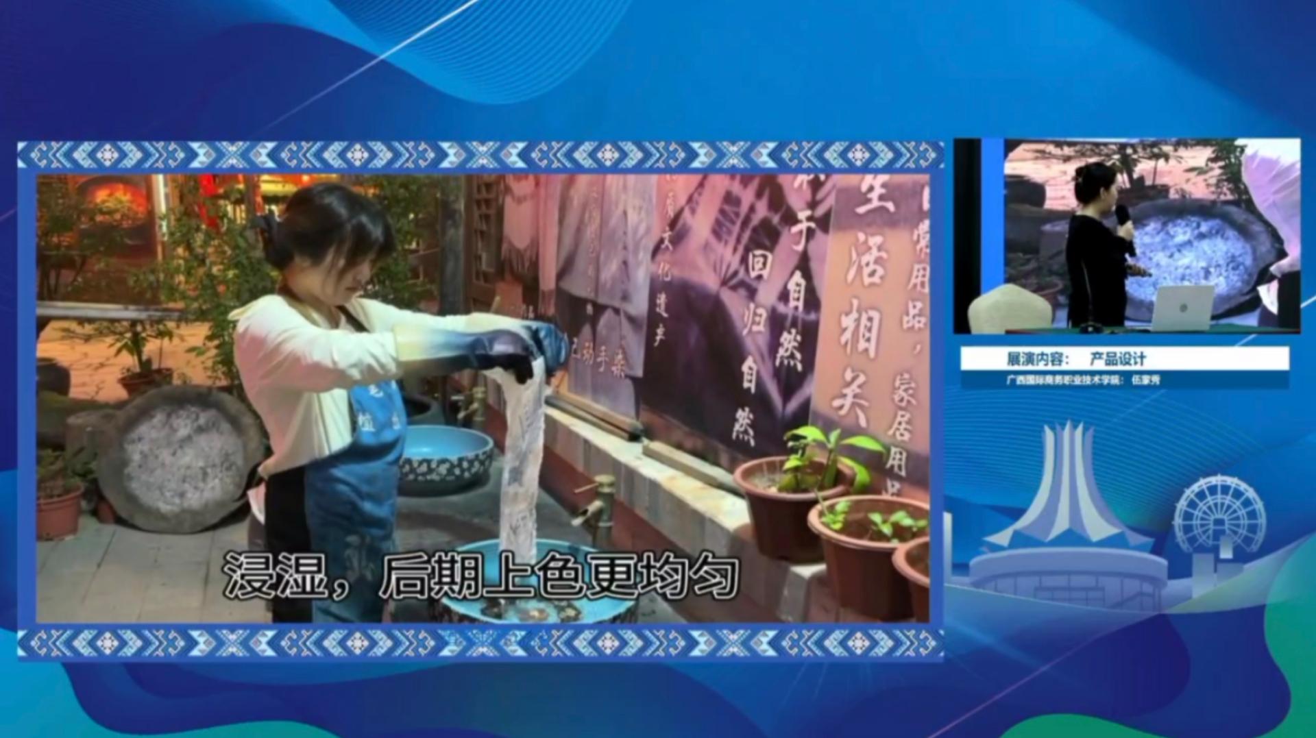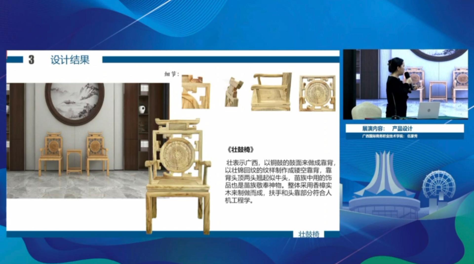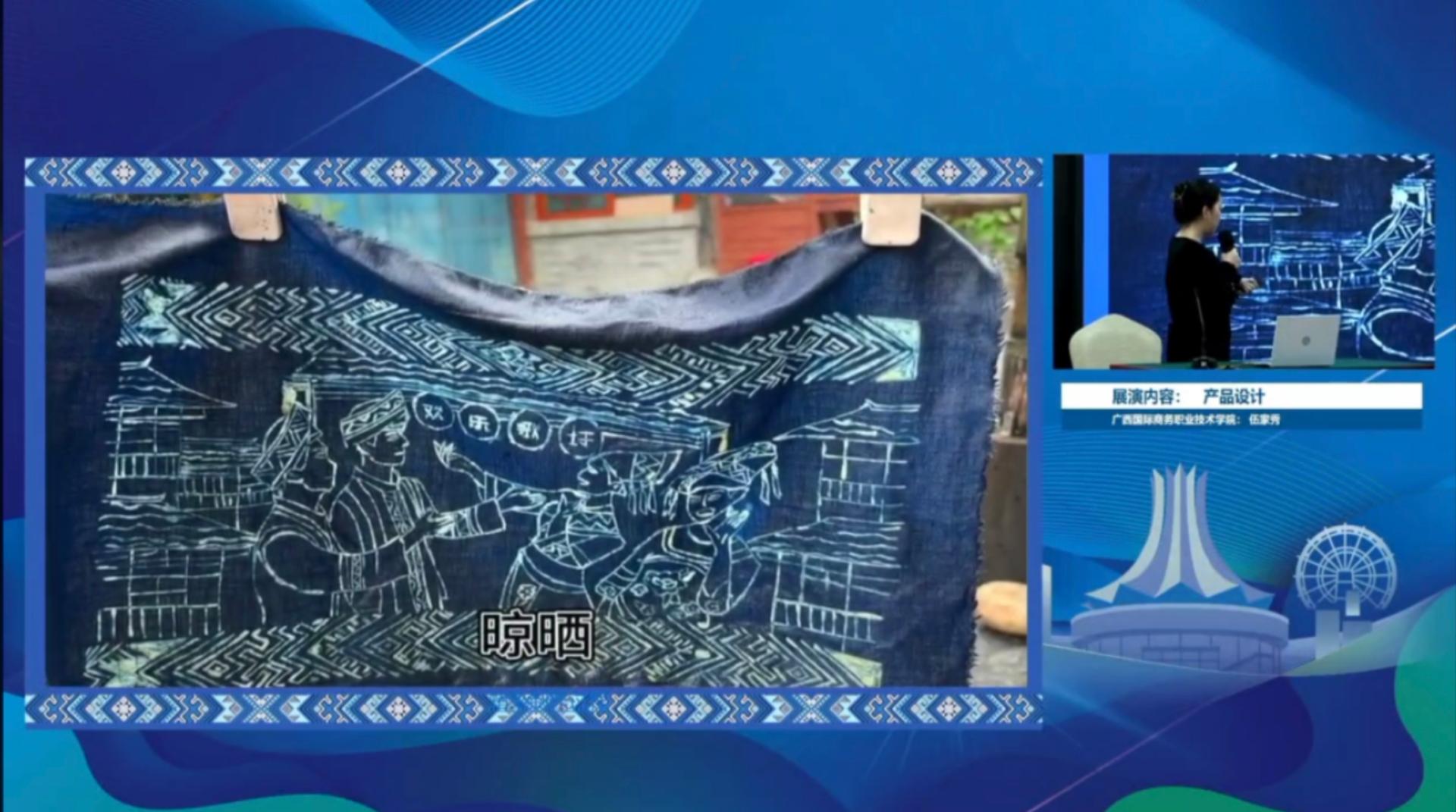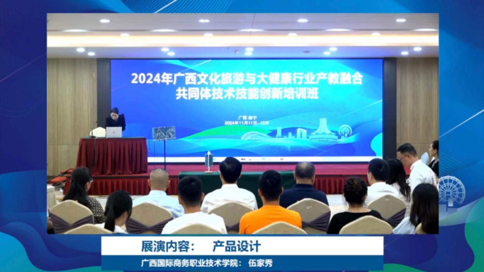 在技能展演和交流环节中,广西国际商务职业技术学院数字艺术学院合作企业武汉中部对外经济技术合作集团有限公司伍家秀老师进行了精彩的展播。她以“广西文旅与传统文化融合下的产品设计”为主题,通过两组学生的毕业设计作品进行了分享,展示了学生们在文化传承与创新方面的才华。