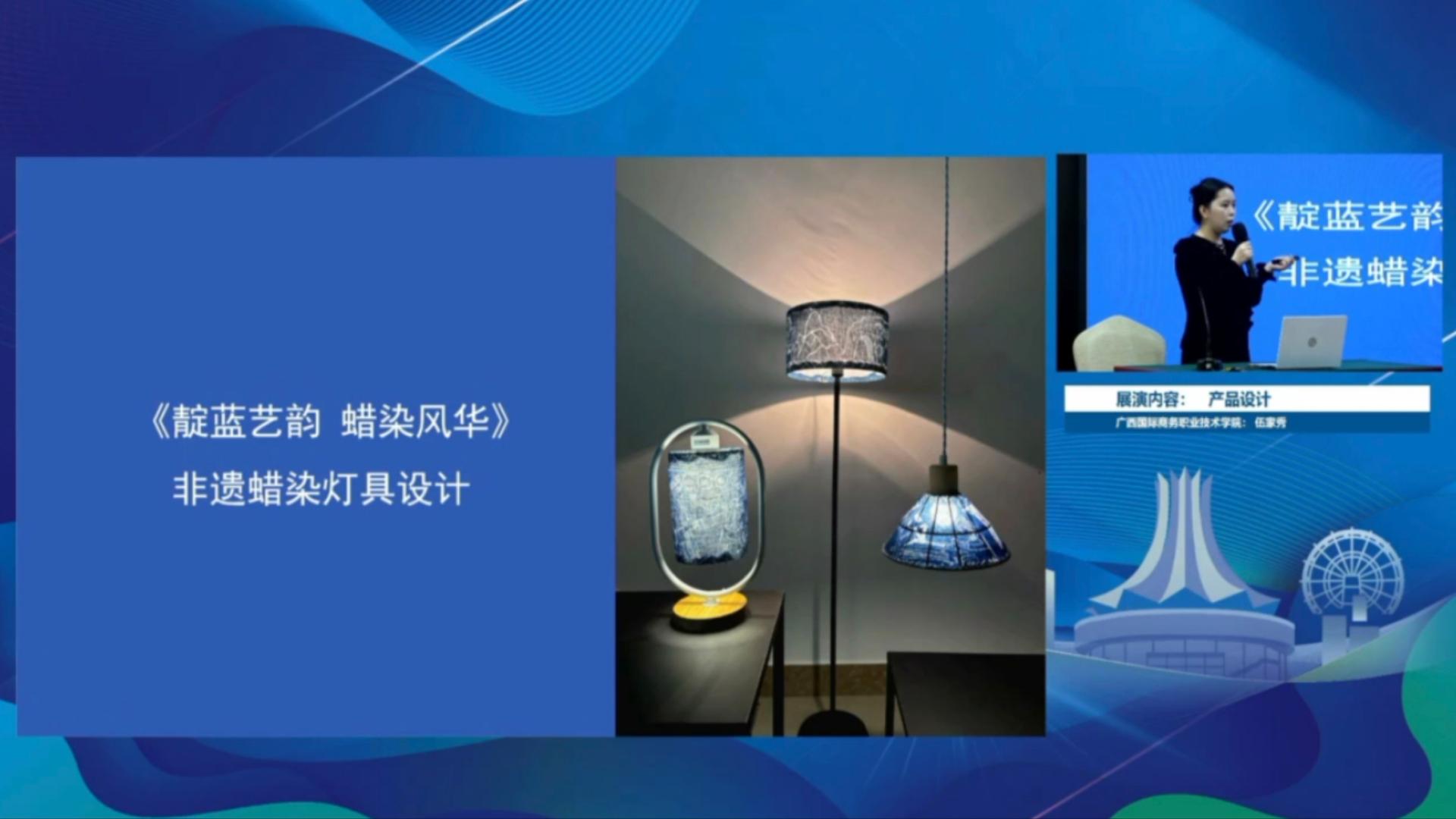 首先进行展播的是由22级产品艺术设计专业的盛宏莲、罗慧玲和林广桧同学设计的《靛蓝艺韵 蜡染风华——非遗蜡染灯具设计》。这组设计灵感来源于广西壮族的蜡染艺术,巧妙地将广西民族传统特色文化中的广西三月三歌圩节、广西侗族柳州三江的高山流水民俗、广西非遗织布工艺和晒布的场景以及广西桂林山水象鼻山等作为图案元素与非遗蜡染工艺相结合,打造出一系列充满文化气息的灯具。这些灯具不仅美观大方,更通过设计语言传递了广西深厚的文化底蕴。