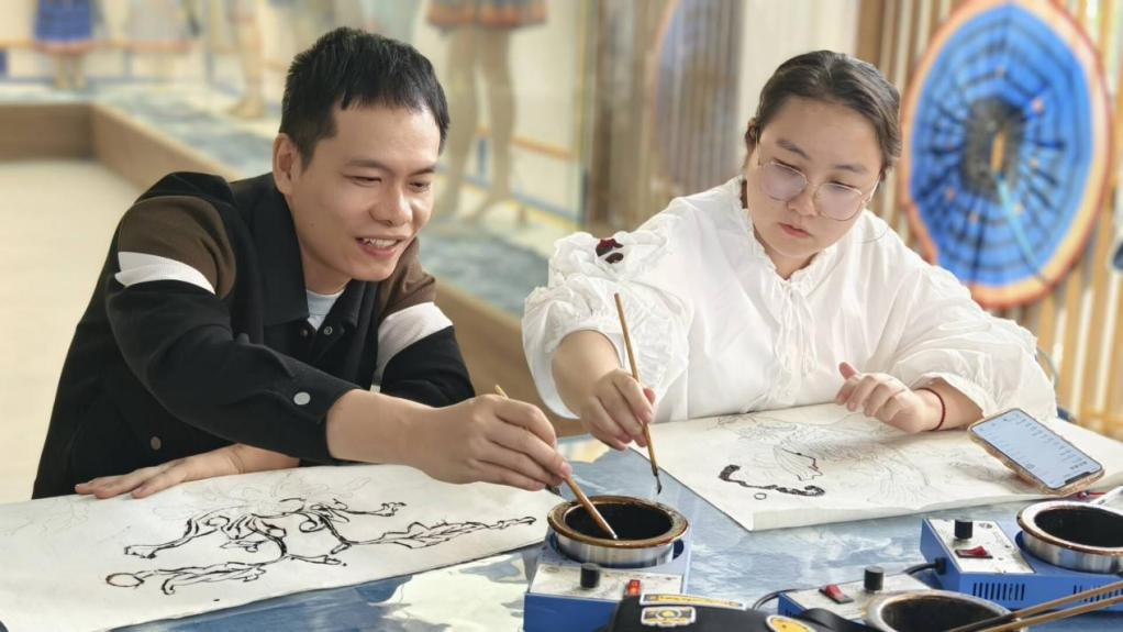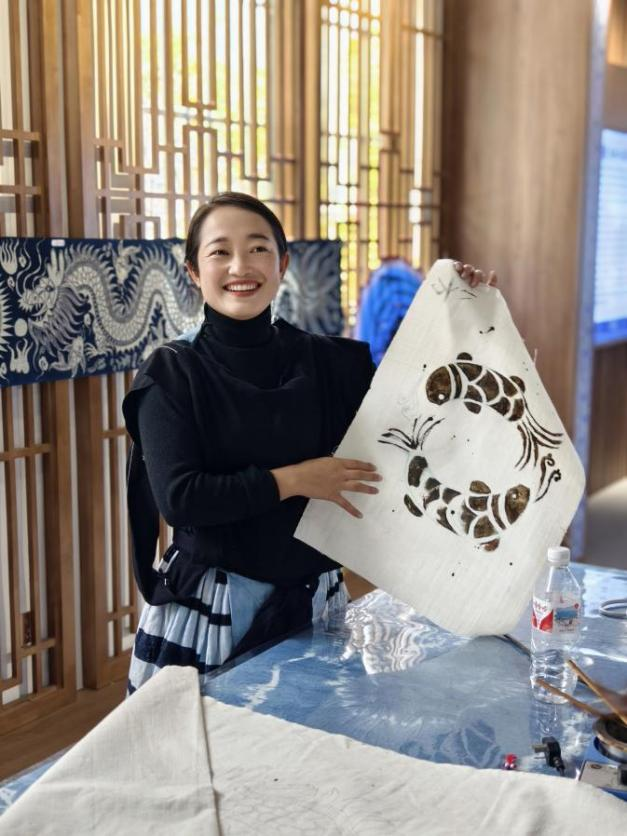 11月14日上午,在广西南丹县里湖瑶族乡朵努社区染艺坊,国家非物质文化遗产瑶族服饰县级代表性传承人、社区党支部书记黎秋亿的带领下,数艺师生一行来到黎凤珍技能大师工作室进行参观考察,并体验白裤瑶传统特色粘膏画。