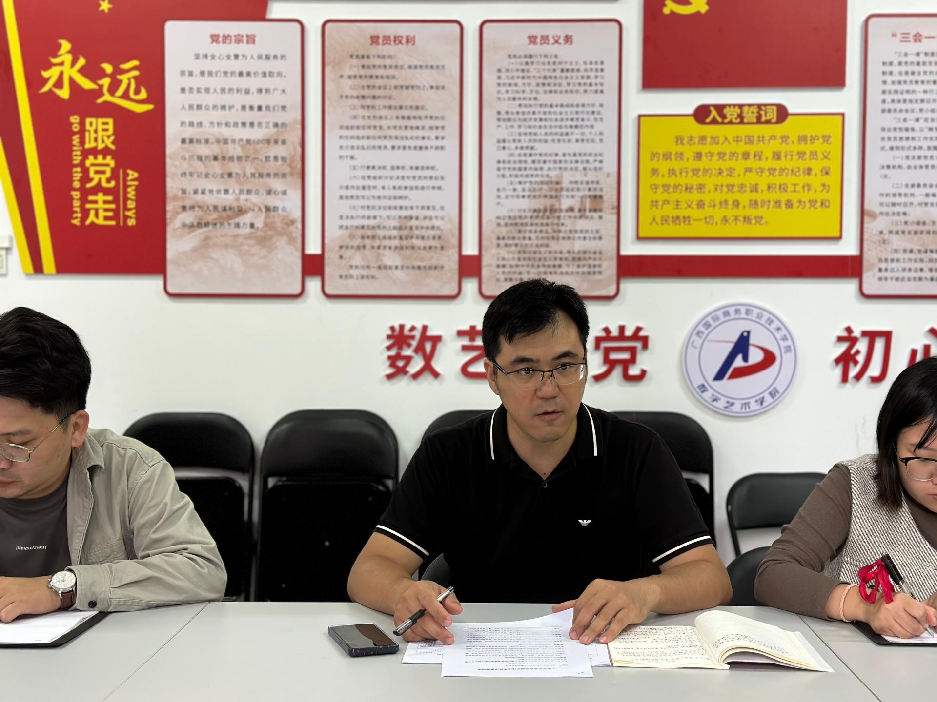 随后,黄恒拾与参会人员一起学习《广西高校党建工作考核指标体系》,并根据考核指标内容就结合学院下半年学院党建工作要点提出要求。他强调,两个支部要认真研读对照自治区和学校的考核指标,扎实开展党支部“三会一课”、主题党日、党风廉政建设、统一战线工作、意识形态工作等常规任务,做好党员教育和发展管理工作,落实对流动实习学生党员的管理制度。其次,要结合学院专业特色充分挖掘党支部特色,加强党建品牌的提炼和总结。最后,要坚持党建引领,紧紧围绕立德树人根本任务,推动党建与业务的双融合、双提升。