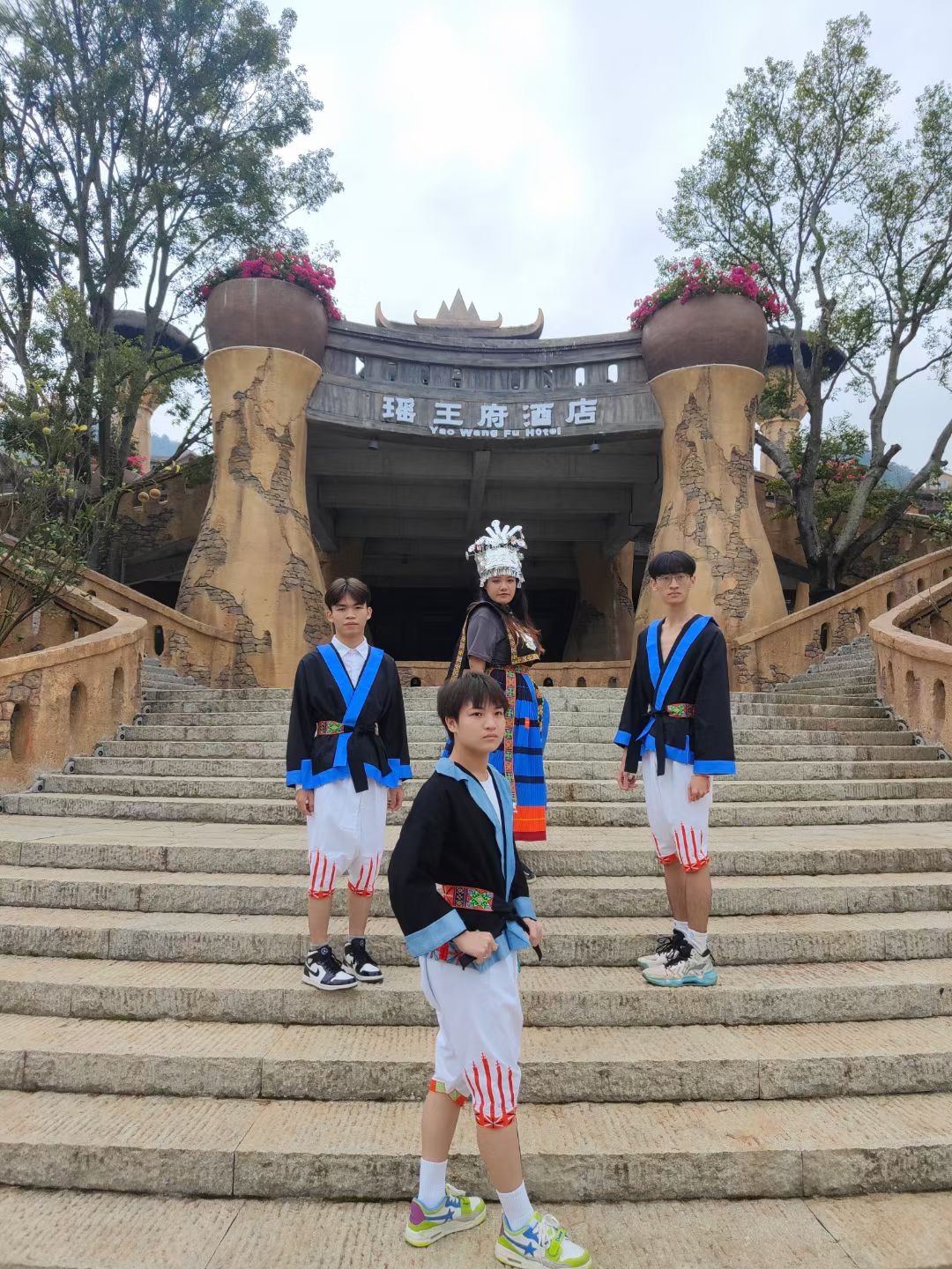 10月13日上午,师生们前往位于里湖乡的南丹县重点民俗文化产业综合体“瑶望天下”进行白裤瑶非遗民族文化实地研学活动,现场调研和体验被誉为“人类文明活化石”的白裤瑶民族风情。该产业综合体通过“一店一品”的模式,将南丹的传统服饰、铜鼓文化、陀螺文化、特色小吃等独特文化展现得淋漓尽致。在非遗传习展示厅内,师生们了解了白裤瑶服饰的制作工序。一套白裤瑶服饰,从原材料的制作到成品的生产,整个过程均为手工制作,包括养蚕、纺纱、跑纱、晒纱、织布、采粘膏、染布等多个环节。从服饰的制作工艺即可反映出白裤瑶族人民所追求的淳朴和自然之美。