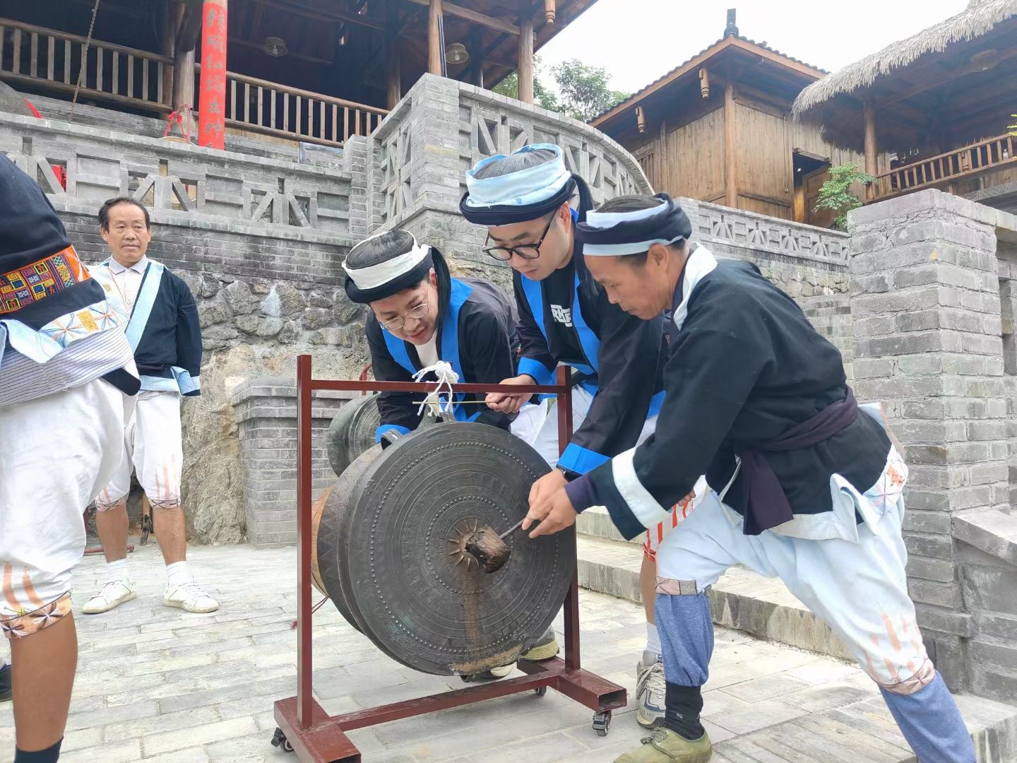 教师刘阳、董三甲沉浸式学习体验铜鼓表演技艺