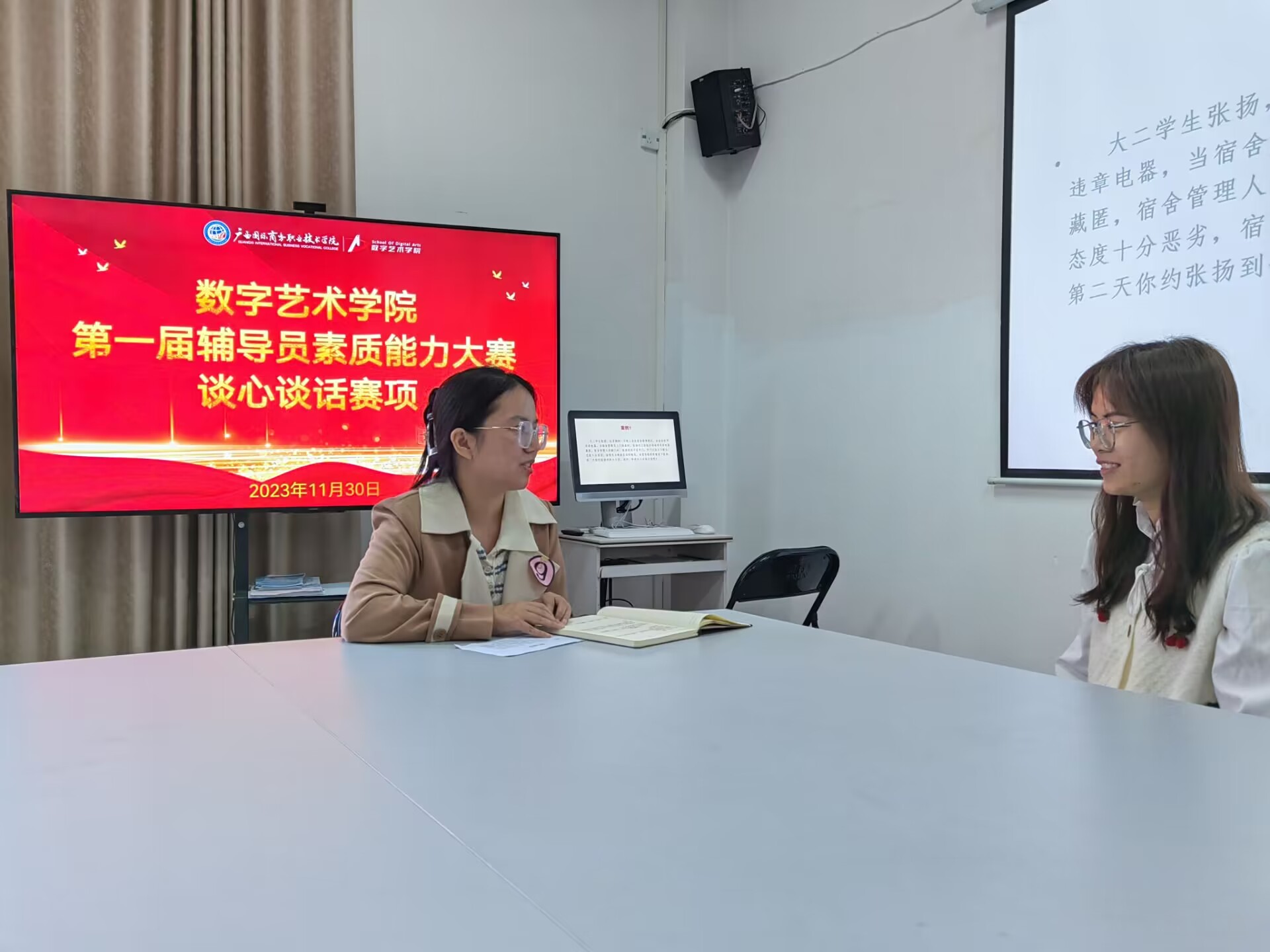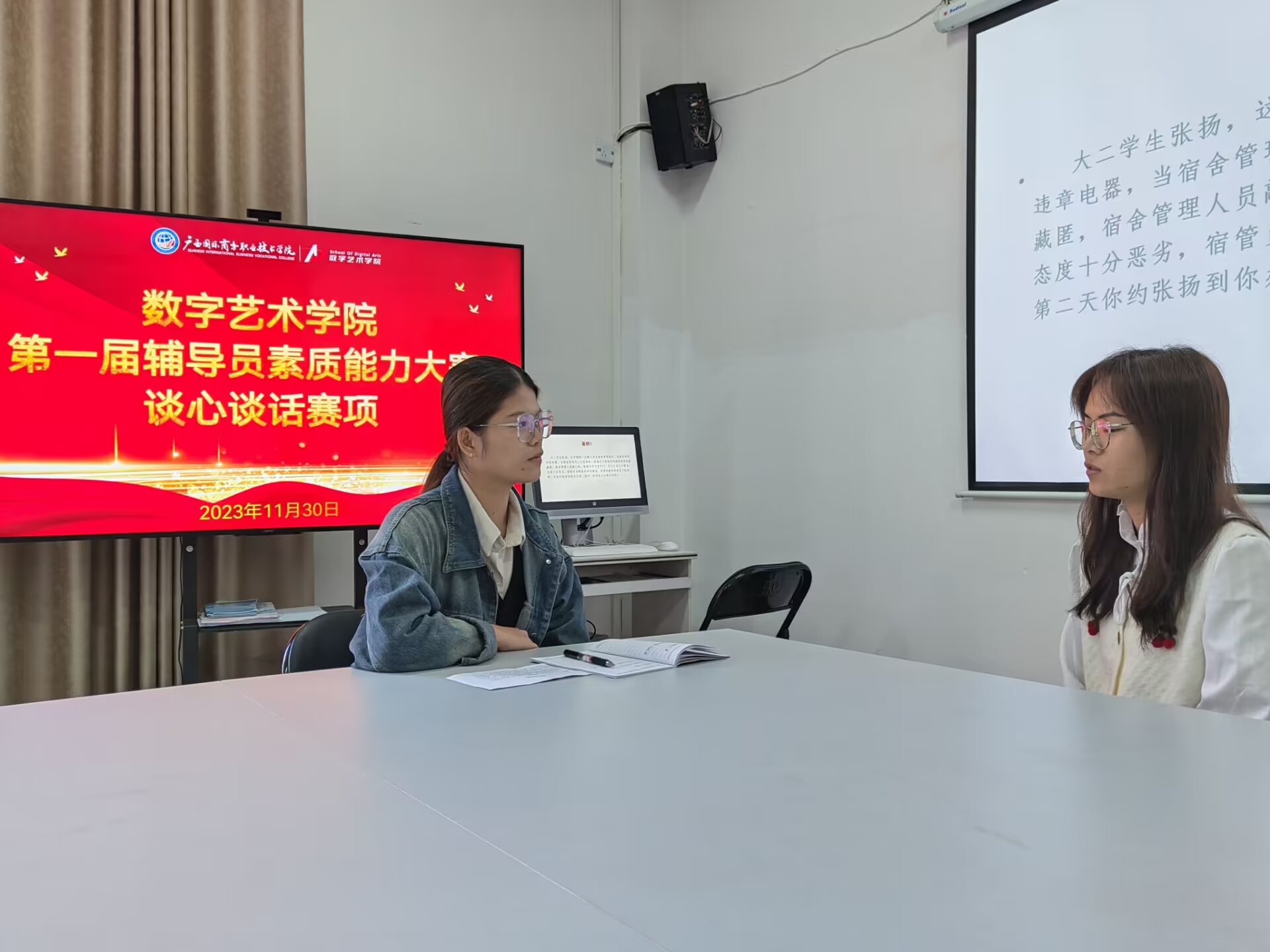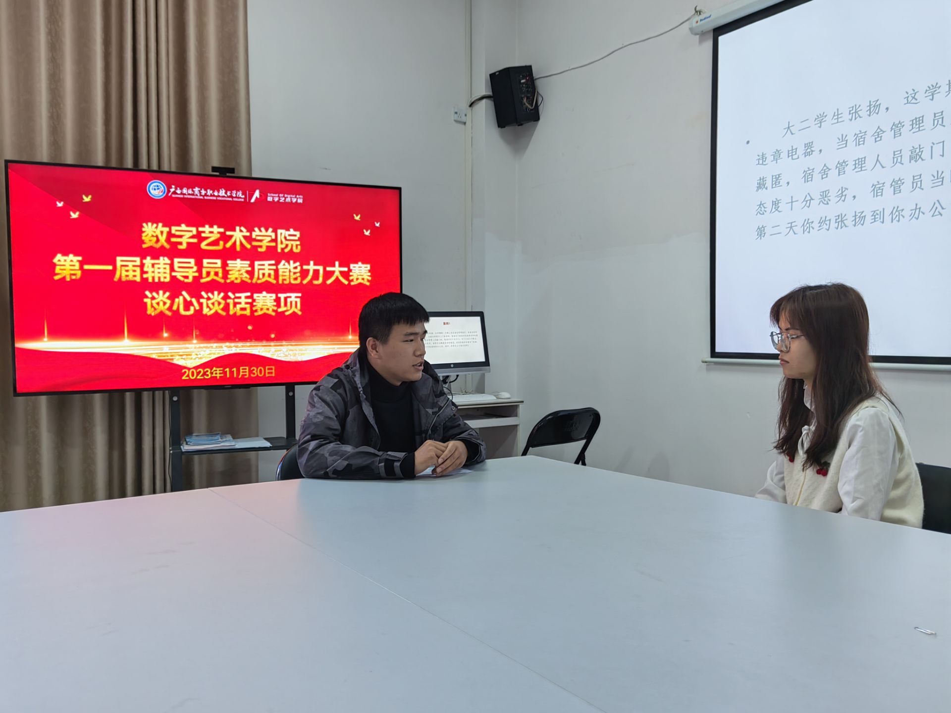 11月30日,为深入学习贯彻习近平新时代中国特色社会主义思想和党的二十大精神,落实《普通高等学校辅导员队伍建设规定》要求,不断提升辅导员的专业素质和育人能力,数字艺术学院在3栋308办公室举办第一届辅导员素质能力大赛之谈心谈话比赛。数字艺术学院党总支副书记黄恒拾、团总支书记谭丽君和创新创业学院团总支书记苏哲担任评委,共10名校、企辅导员参加比赛。