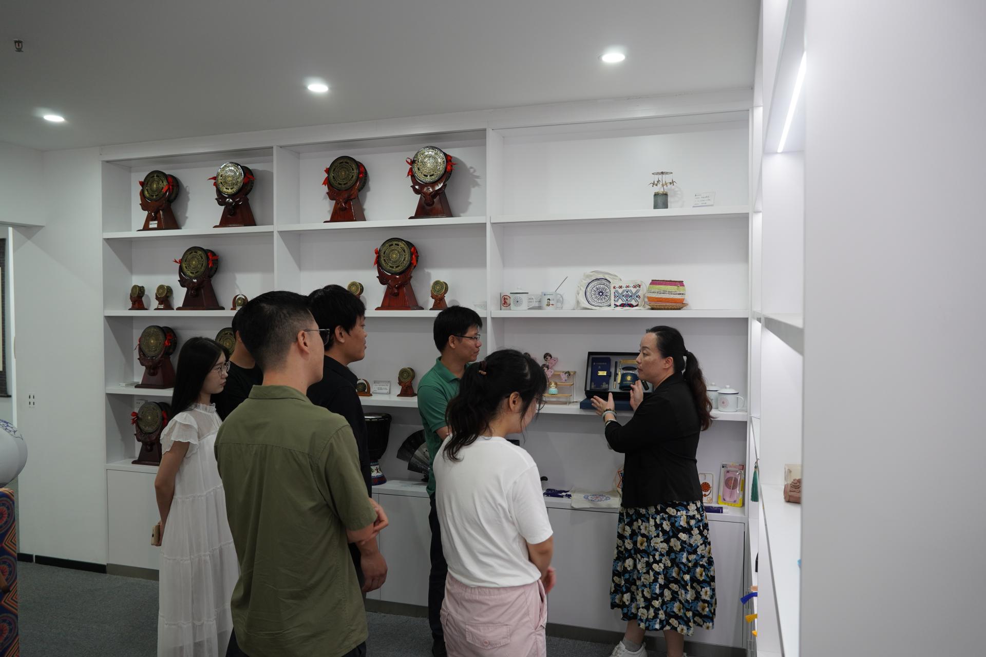 双方在观看《非遗文化民族文化(瑶族铜鼓习俗)》科普教育视频后,由谢娉婷引导参观民族文化传承创新职教基地。随后的学术交流与探讨环节中,参会教师诚恳提出非遗文化教育工作中遇到的问题与困惑,邹桂森逐一细致地对每个问题深入解答,双方围绕学科建设、人才培养、科研合作、文创产品设计开发推广、学生思政教育与党支部建设等问题展开了广泛而深入的探讨,现场氛围活跃。与会教师纷纷表示,邹副教授提出的建议,方法详实,内容丰富,为下一步文化教育工作提供了更为深刻且全面的指导,有利地拓宽了自身学术视野。