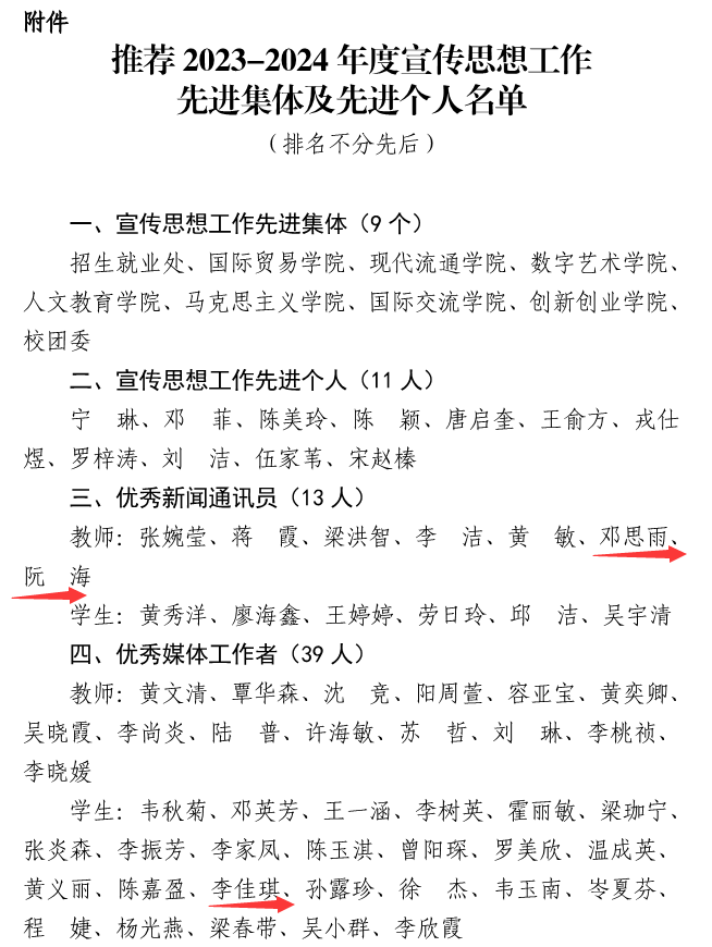在宣传思想工作领域,学院同样成绩突出,荣获2022-2023年度宣传思想先进集体,这一荣誉是对学院宣传思想工作的高度认可。此外,邓思雨、阮海两位同志被评为优秀通讯员,他们用敏锐的视角和生动的笔触,及时传递学院的重要信息和精彩故事。“小仙鹟”新媒体工作室李佳琪同学荣获优秀新媒体工作者称号,在公众号平台上展现了出色的新媒体创作和运营能力,以独特的视角、创新的形式和优质的内容,为学院的宣传工作增添了亮丽的色彩。