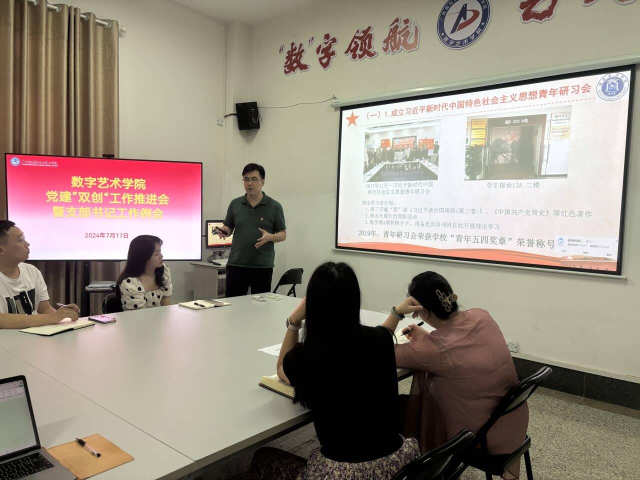 7月17日,为进一步加强基层党组织建设,提升基层党建工作质量,数字艺术学院党总支于3栋308会议室召开党建“双创”工作推进会暨党支部书记例会。会议由学院党总支书记黄恒拾主持,党总支全体委员、组织员及各党支部书记、支委参加。