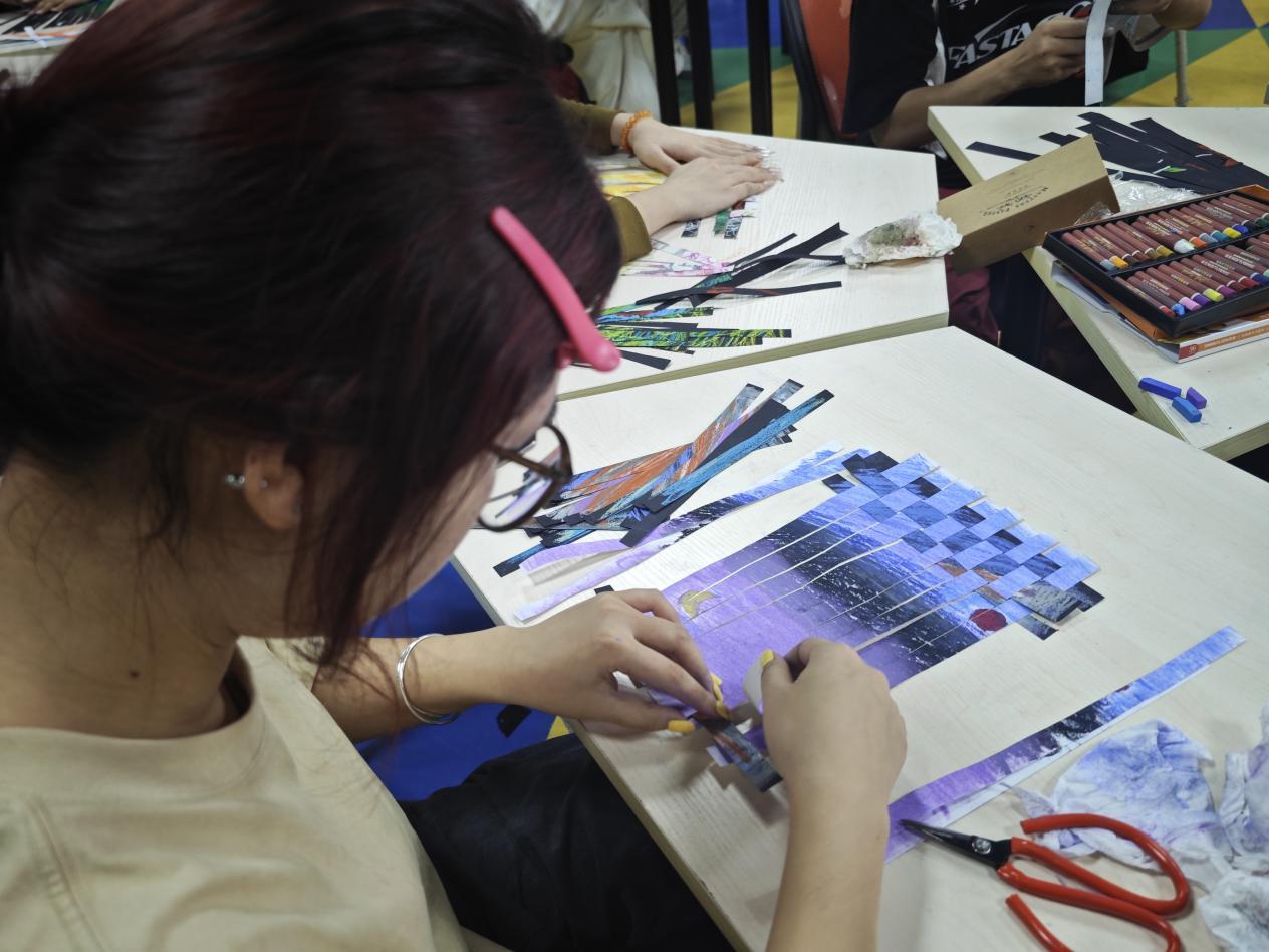 随后,程琳丽指导同学们将这些艺术作品撕成条状。这一环节看似简单,却蕴含深意:通过将作品撕碎,同学们体验了“破坏”和“重构”的过程。这种解构与重组不仅象征着情绪的释放和重新组织,也让大家对自己的内在世界有了更深刻的认识。