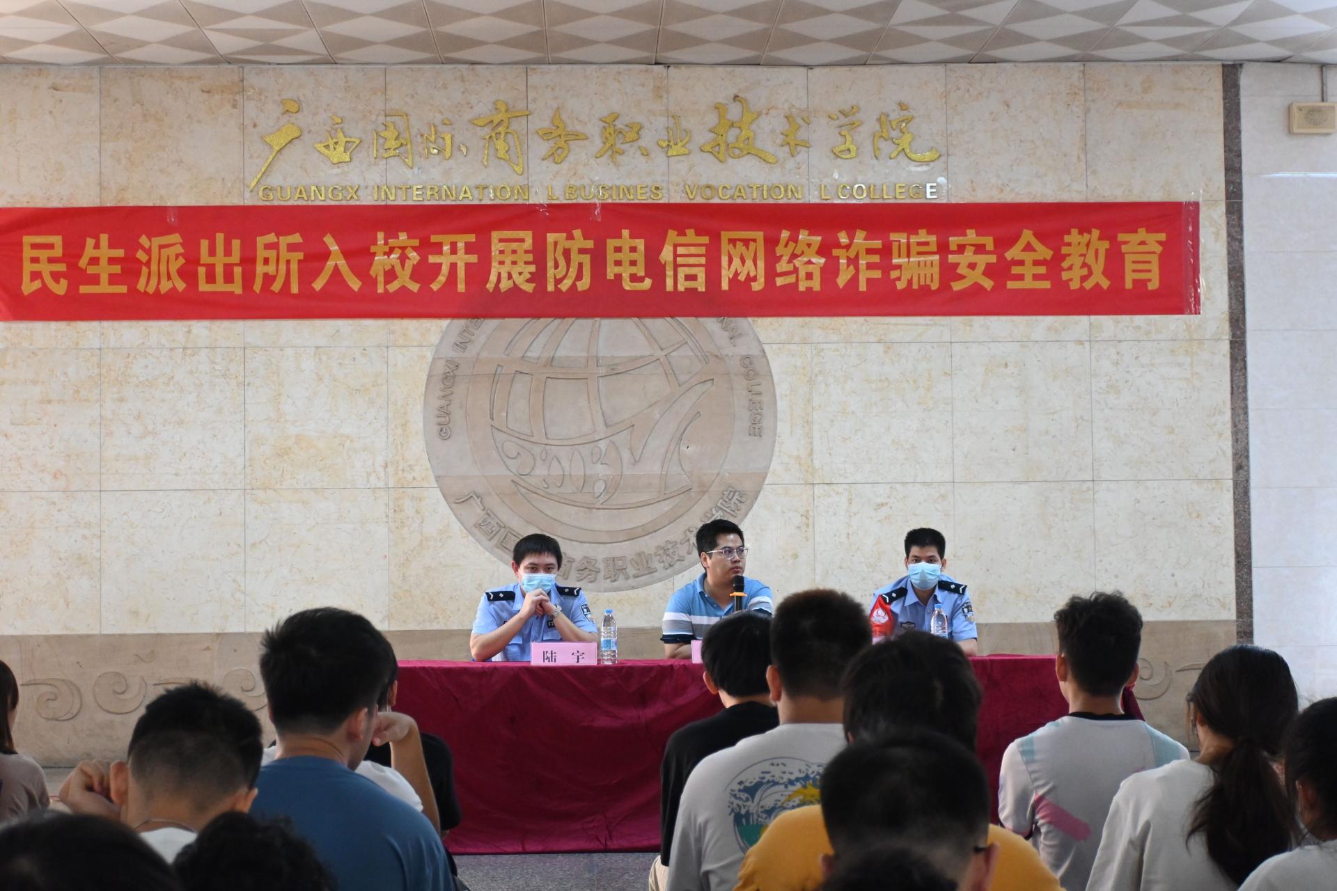 11月11日下午,为进一步增强学生安全防范意识,提升防范电信网络诈骗能力,数字艺术学院在图书馆一楼举办防电信网络诈骗安全教育讲座。活动邀请到南宁市民生派出所陆宇等4名警官为2021级和2022级约800名学生讲授防范电信网络诈骗技巧。讲座由学院党总支专职副书记敬礼主持。