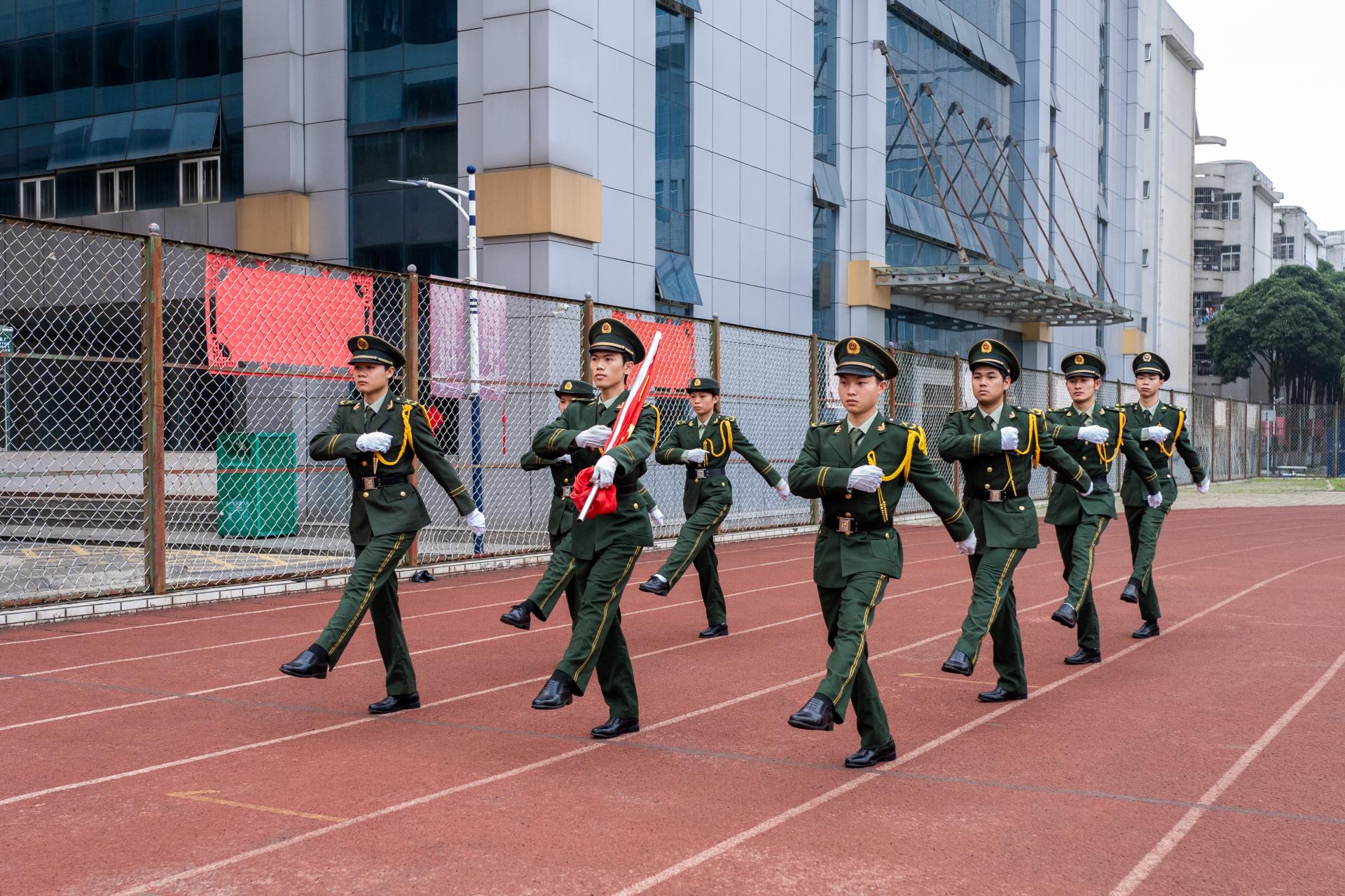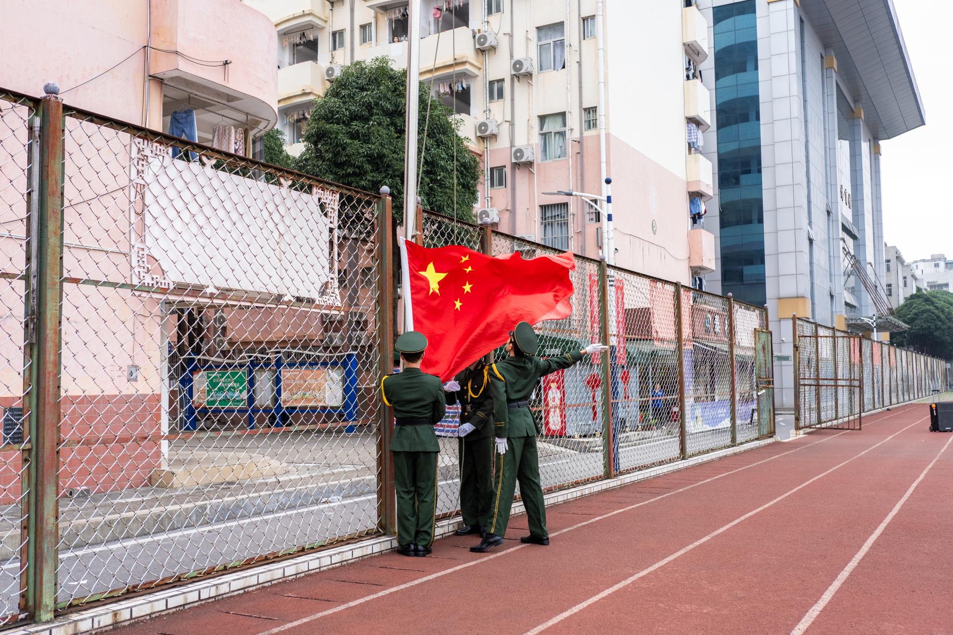 迎着春日清晨的第一缕阳光,校国旗护卫队成员们昂首挺胸,步伐整齐地走向升旗台。随着庄严的中华人民共和国国歌奏响,鲜艳的五星红旗冉冉升起,师生们齐声高唱国歌,豪情满怀,默默地在心中许下向梦而行、强国有我的誓言。