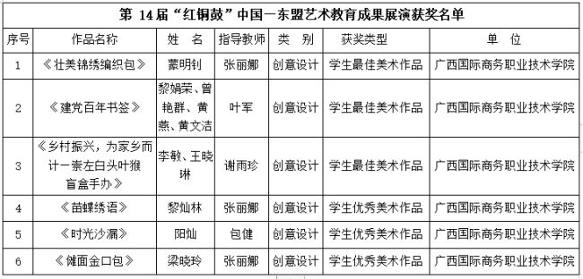 2022年5月31日,根据自治区文化旅游厅和自治区联合下发的《关于举办第14届“红铜鼓”中国-东盟艺术教育成果展演活动的通知》(桂文旅发[2022]64号)公布了本次活动获奖作品的名单。数字艺术学院代表学校的参赛作品表现优异,在展演中喜获佳绩,共有6件美术作品获奖,其中学生最佳美术作品3件,学生优秀美术作品3件。具体获奖名单如下: