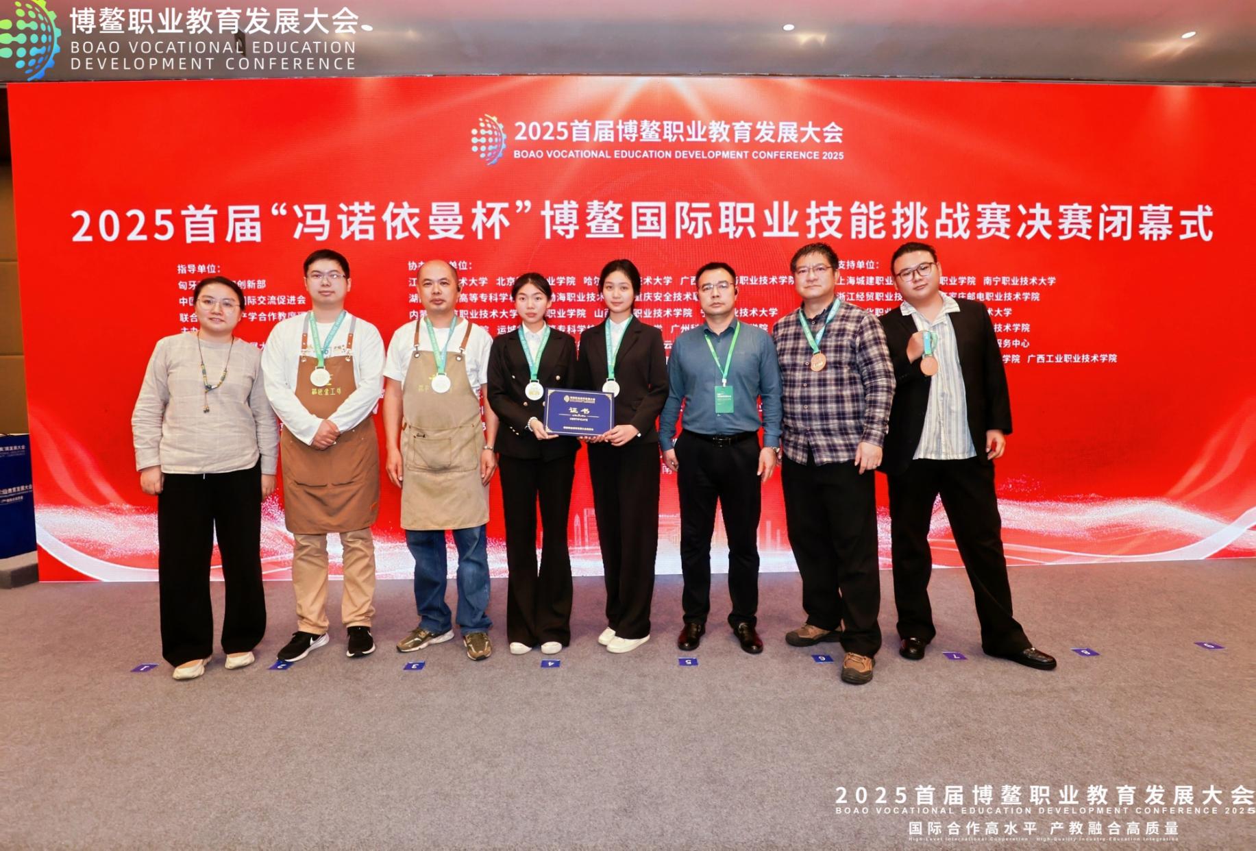 12月8日晚,2025首届“冯诺依曼杯”博鳌国际职业技能挑战赛决赛在海南琼海圆满收官。作为首届博鳌职业教育发展大会的核心组成部分,赛道紧扣 “国际合作高水平、产教融合高质量” 核心理念,以“技融全球,遗韵共赏”为主题,搭建起跨文化交流的坚实桥梁。在这场汇聚全球20多个国家和地区的近100所院校、200余支参赛队伍的高水平角逐中,我校数字艺术学院代表队沉着应战、奋力拼搏,2024级产品艺术设计专业的梁洪梅、黄露欢、刘佳超同学和李春光大师参加多个赛道的角逐,凭借过硬的专业实力和突出的销售业绩脱颖而出,最终斩获2金4银1铜的优异成绩,学校还获得突出贡献奖,体现我校在对接国家战略、传承中华文脉、服务产业发展的标志性成果。
