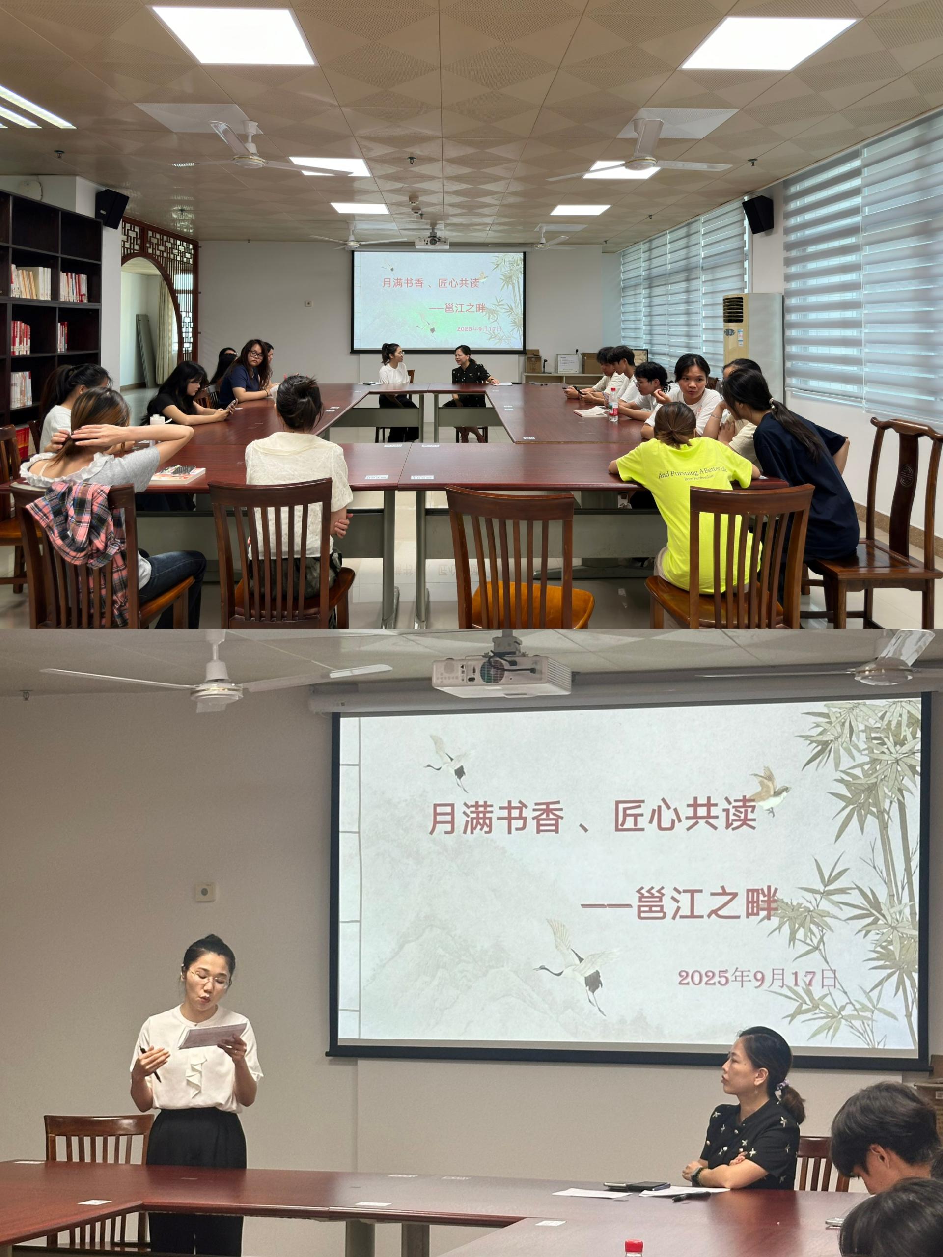 外语学院梁资姿老师作为特邀导读嘉宾,以富有感染力的讲述为活动拉开帷幕。从中秋的传统寓意到广西多元文化的独特魅力,从“共读”的深层价值到“匠心”的精神内涵,梁老师娓娓道来:“阅读是一场跨越时空的对话,而文化传承更需要我们以匠人之心细细打磨、真诚传递。”她的话语迅速点燃了现场的书香氛围,也让在座同学沉浸于文化与情感交融的氛围中。