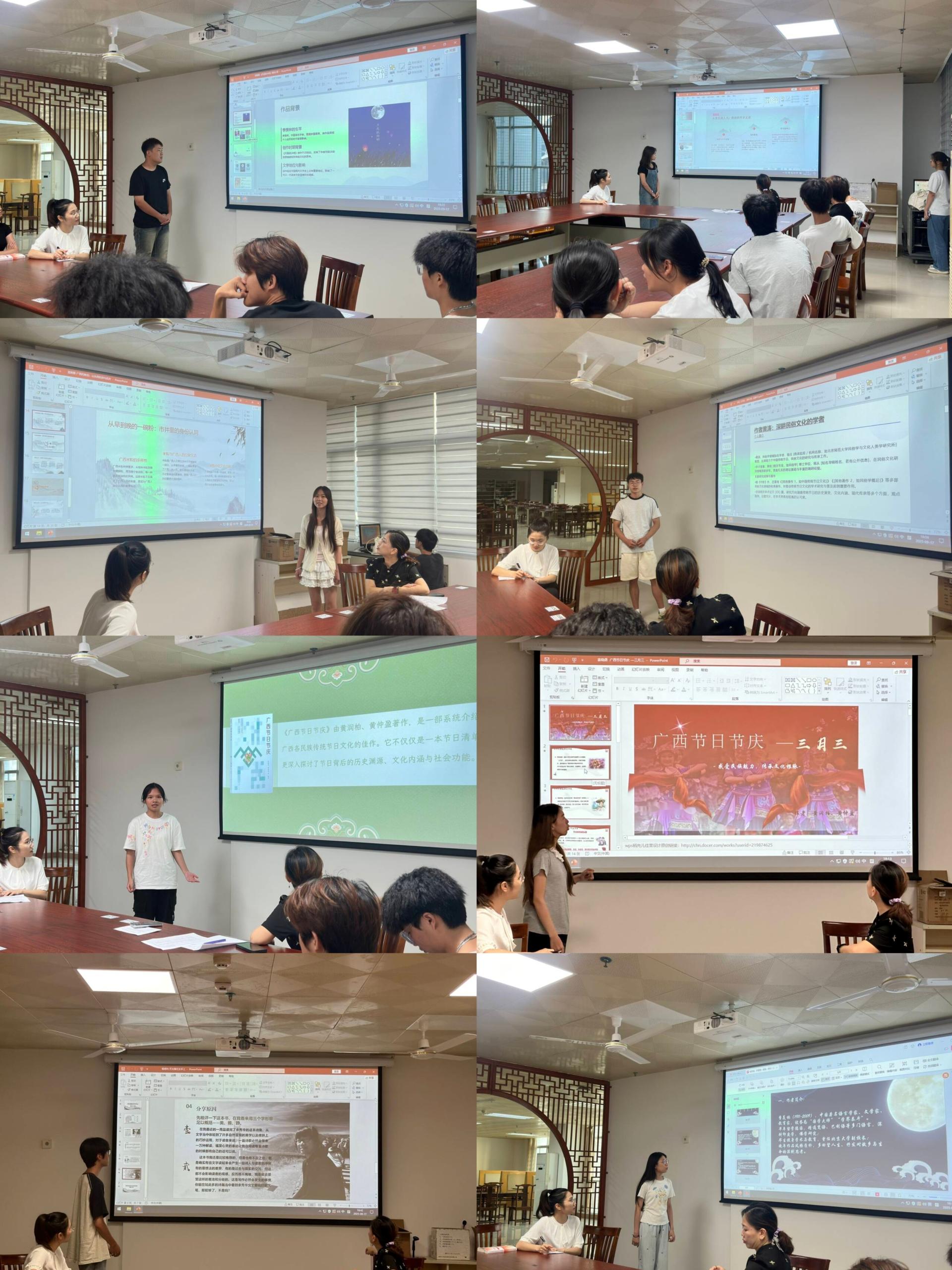 随后,活动进入了精彩的PPT分享环节。由创新创业学院与大学生读者协会共同组成的八个小组依次上台,围绕广西文化与中秋节的主题,结合推荐书目展开汇报。从壮族绣球的制作技艺到桂林山水的文化意象,从柳州螺蛳粉的饮食哲学到北海疍家渔歌的传承现状,从侗族大歌的音乐之美到中秋节的由来、传说……同学们年轻视角和创新表达,将文化观察与多媒体形式巧妙结合,既有扎实的调研支撑,也不乏生动有趣的互动设计,展现出对本土文化的深切关注与全新解读。