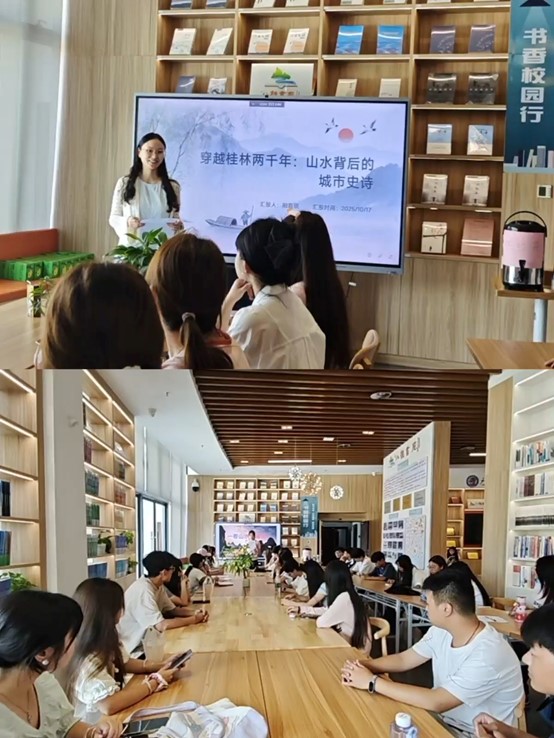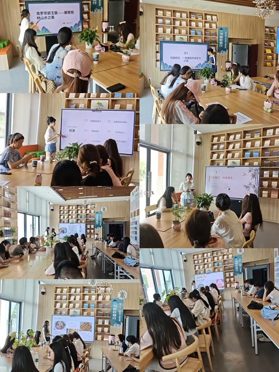 活动现场气氛热烈,八桂书苑内座无虚席,学术与人文气息相融交织。活动突破传统阅读模式,着力构建一个跨学科、跨专业的地方文化学习平台,引导学生跳出游客视角,结合自身专业背景和未来职业方向,重新诠释桂林的文化内涵。在阳老师的引导下,同学们围绕《桂林风土记》《桂林山水》《徐霞客游记·粤西游日记》《桂林美食》《桂林通史》等经典书籍,分组展开深入研读与交流,并以PPT形式展示了各自的见解与思考。这种从“职业视角”出发的解读方式,不仅深化了同学们对桂林文化的立体认知,也展现了跨学科思维在理解地方性知识中的独特价值与创新潜力。