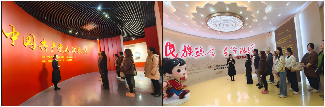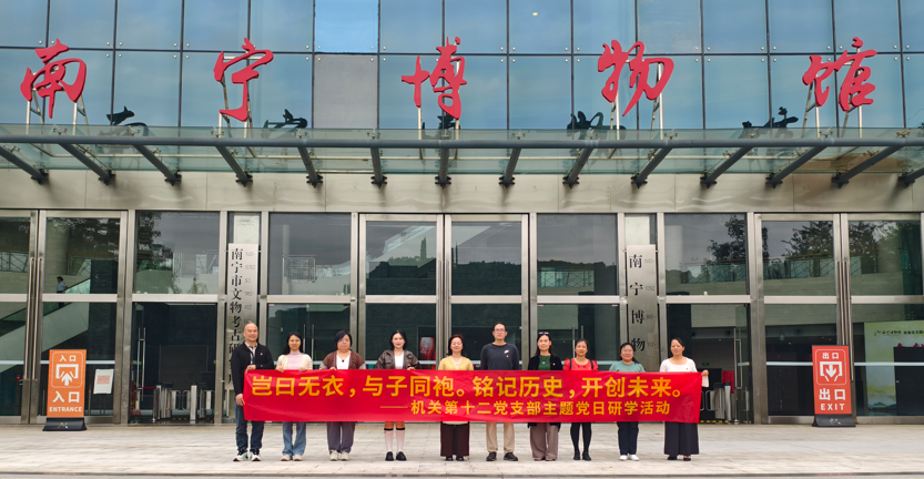 研学第一站支部党员走进南宁博物馆,参观了“岂曰无衣 与子同袍——广西与上海抗战中的国际互助”特展与“邕城百年——近现代南宁陈列”展。在抗战主题展中,一件件珍贵的文物和历史照片,生动再现了烽火岁月里中国人民与国际友人同仇敌忾、共御外侮的感人篇章,党员们深刻感受到了天下兴亡、匹夫有责的爱国情怀与国际主义精神。“邕城百年”陈列展,让大家系统了解了近现代南宁波澜壮阔的发展历程,从历史变迁中增强了服务地方、建设壮美广西的使命感和责任感。