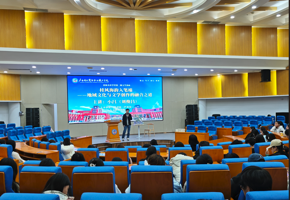 为深入贯彻美育工作精神,持续打造学校“桂海美育学堂”文化品牌,进一步丰富活动内容与形式,充分发挥图书馆在文化传播与知识服务中的主阵地作用,11月20日,“桂海美育学堂”第二期文学讲座在东盟校区图书馆报告厅顺利举行。本次活动特邀中国作家协会会员、广西民族大学硕士生导师小昌(刘俊昌)担任主讲,东盟校区200余名同学积极参与。
