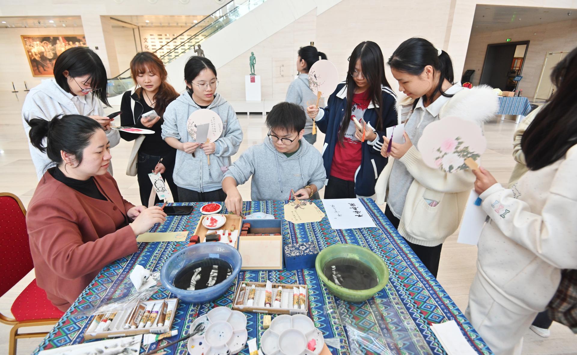 观展结束后,活动进入深度体验环节。美术馆老师为大家系统讲授了水墨画的基本知识、笔墨技法等,并带领师生们赏析了齐白石、吴昌硕等大师的代表作品,从一笔一划中感受传统书画的格调与精神。随后,备受期待的创作实践环节正式开始。本期活动聚焦中国传统青绿山水画与扇面艺术这一非遗载体,老师首先演示了青绿山水的基本设色技法,指导同学们在扇面上勾勒皴染,体验古典山水“咫尺千里”的意境表达。