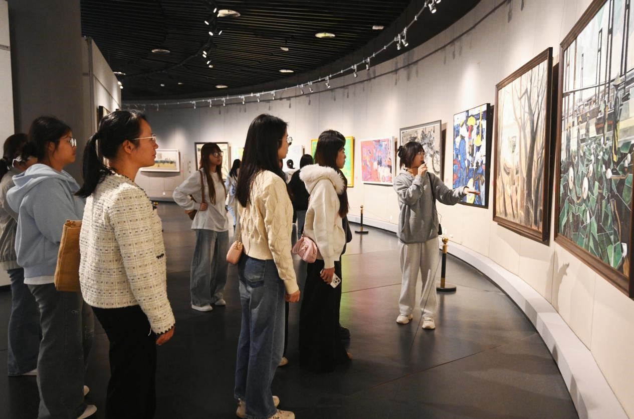 午后,师生们齐聚广西美术馆。在馆内专业老师的引领与讲解下,大家首先有序参观了当期展览,重点观摩了以山水、自然为主题的艺术作品,在对比中感受不同艺术流派在色彩运用、构图思维与意境表达上的差异与魅力,从中汲取创作灵感。