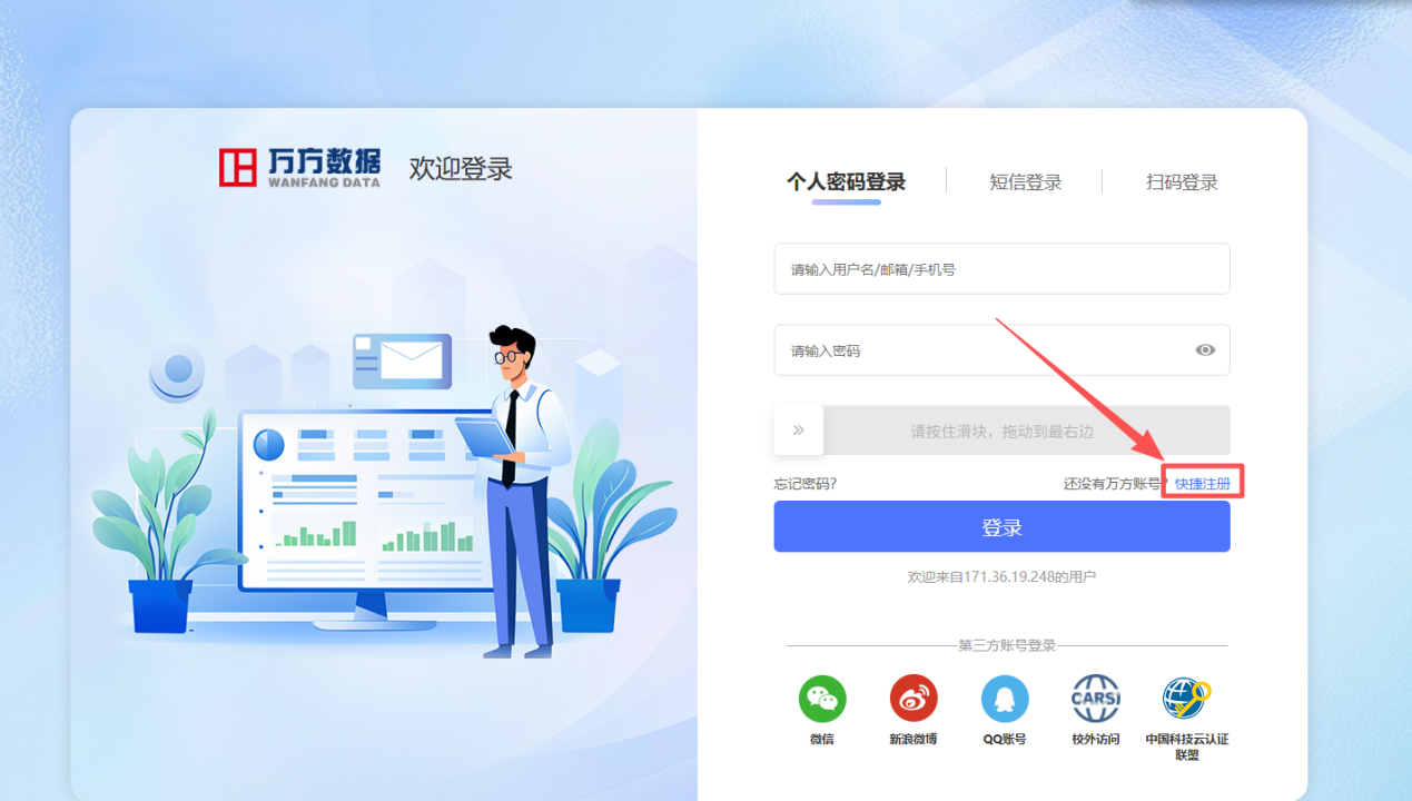 需在校内IP地址内登录后注册账号(“AI智慧研究平台”需登录万方数据个人账号,如没有可自行注册后登录)。如下图操作所示: